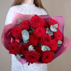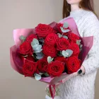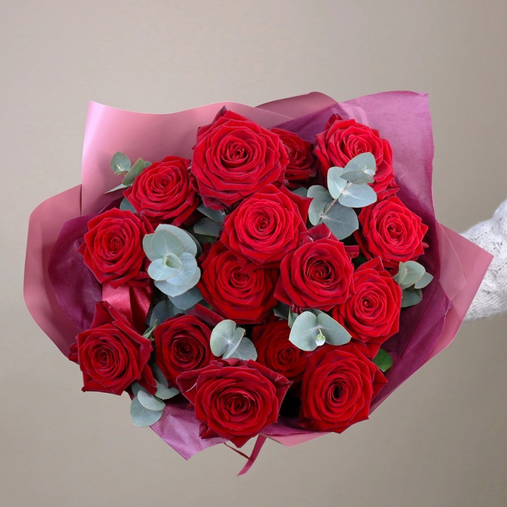 Букет из розовых роз с зеленью эвкалипта. Вы можете выбрать любое количество роз, указанное в перечне к данному букету.