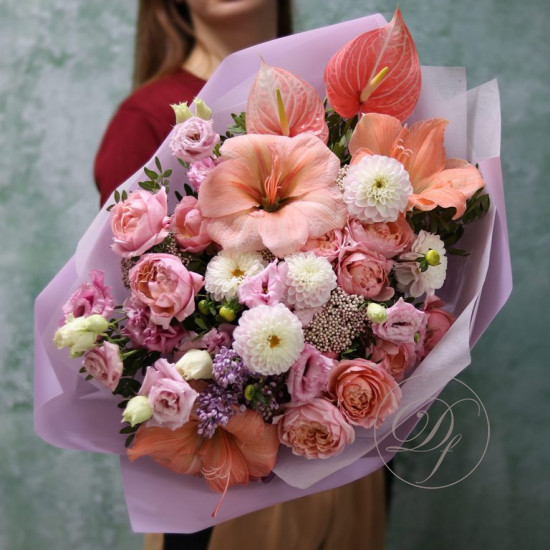 Авторский букет "Сказочная симфония" от цветочной студии Дакота флора. Погрузитесь в мир изысканной красоты с нашим уникальным авторским букетом, созданным с любовью и вниманием к каждой детали. Этот великолепный ансамбль из розовых роз, романтичных пионов Сара бернар, воздушного дельфиниума, пышной гортензии и элегантной эустомы станет идеальным подарком для любого случая.