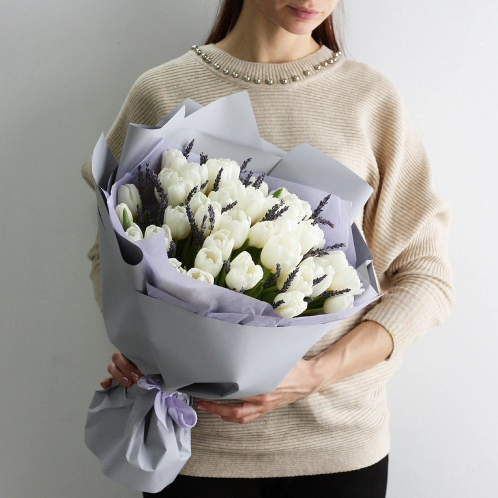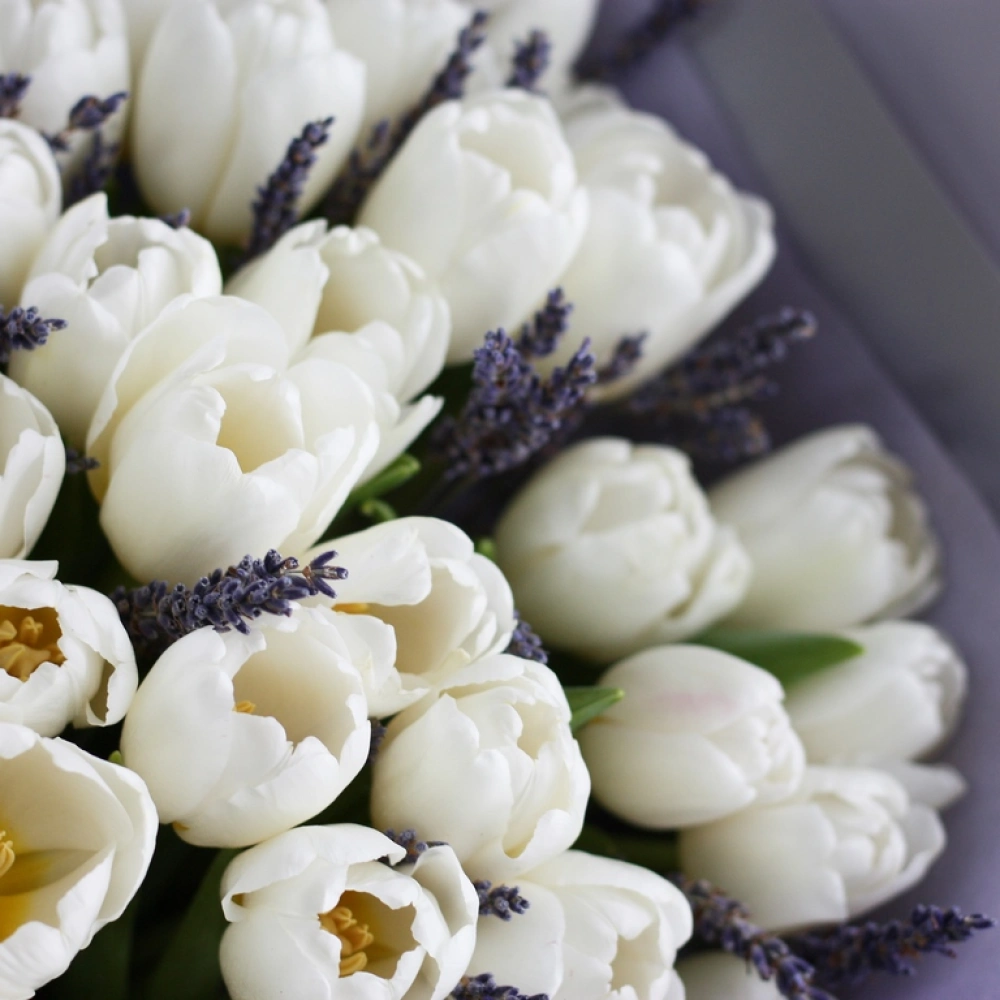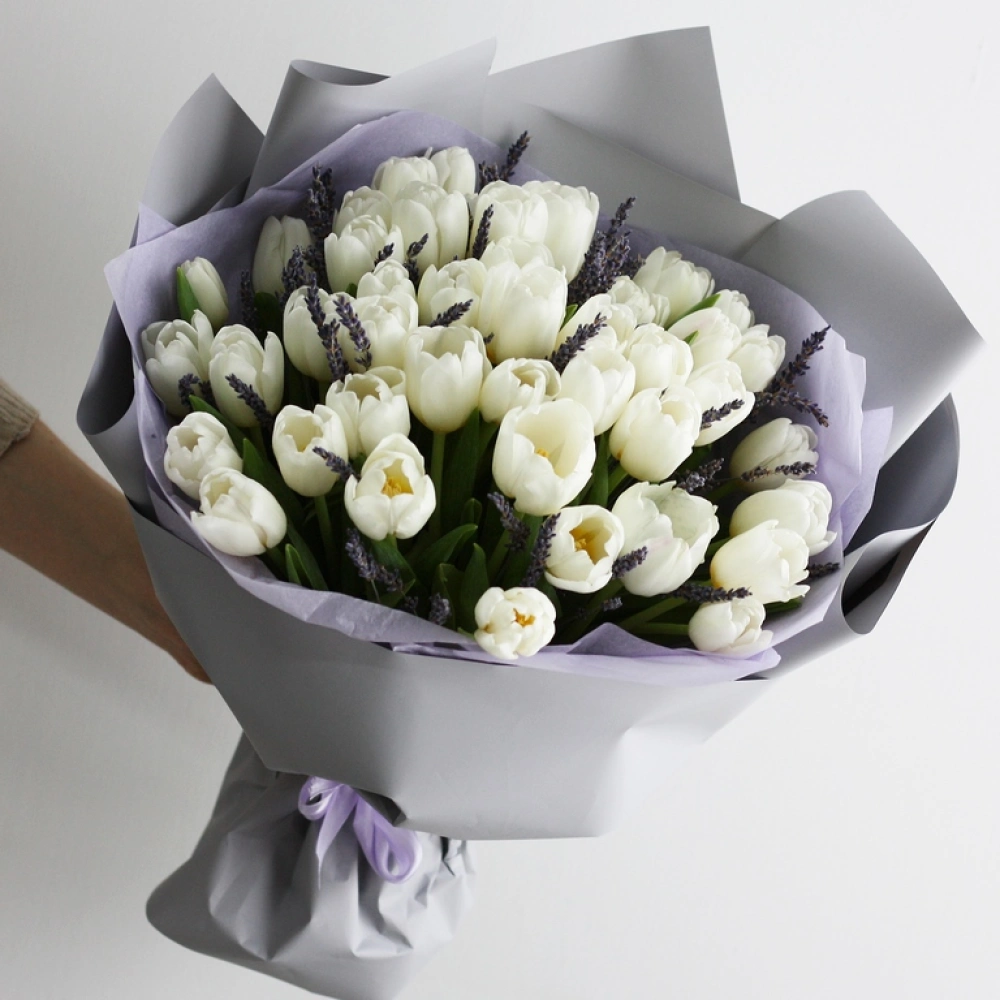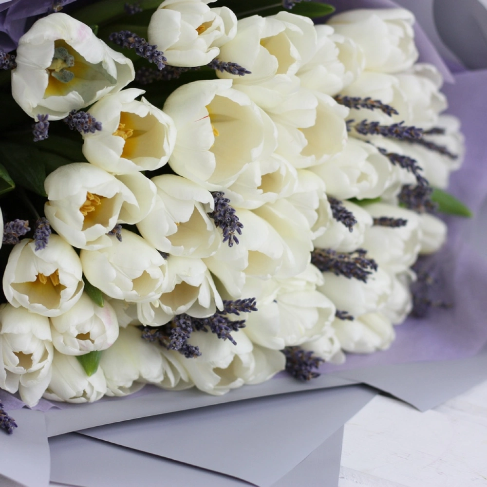 Букет из белых Тюльпанов и лаванды. Вы можете выбрать любое количество цветов указанное в перечне к данному букету.