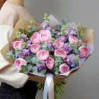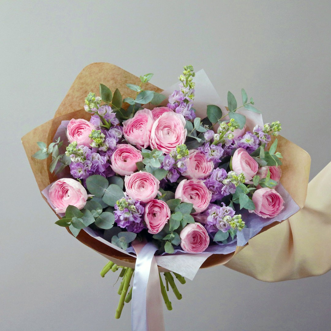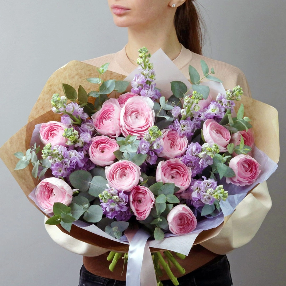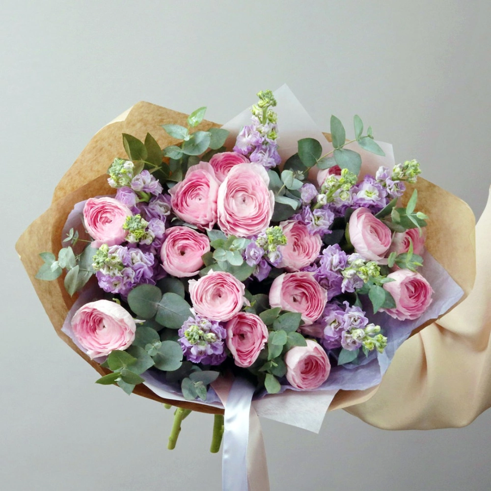 Букет из нежно-розовых ранункулюсов и маттиолы с эвкалиптом. Вы можете выбрать любое количество цветов указанное в перечне к данному букету.