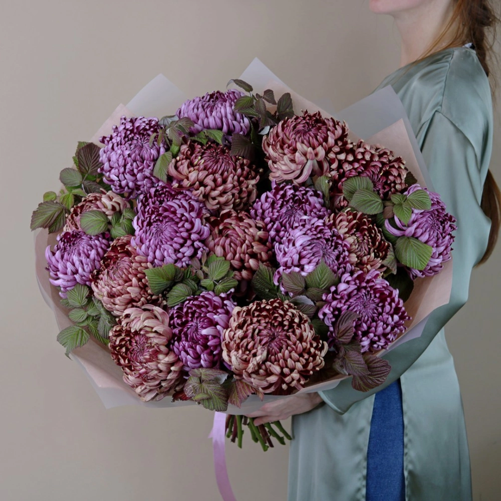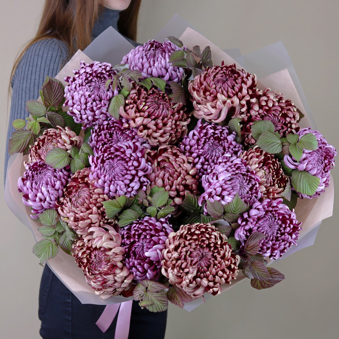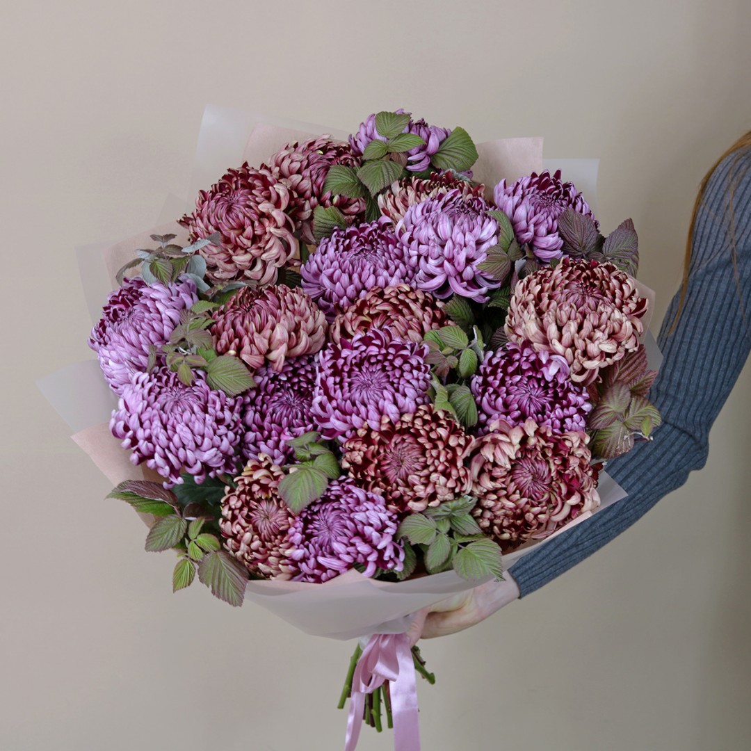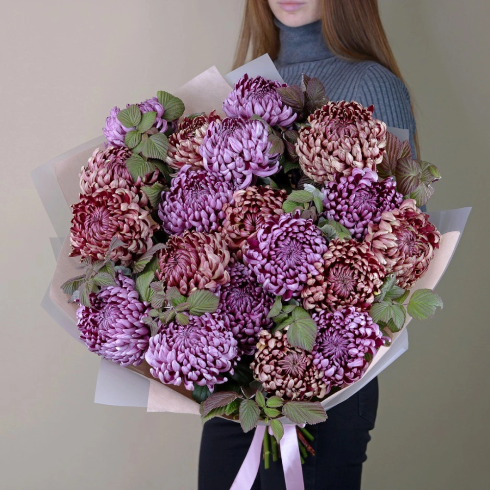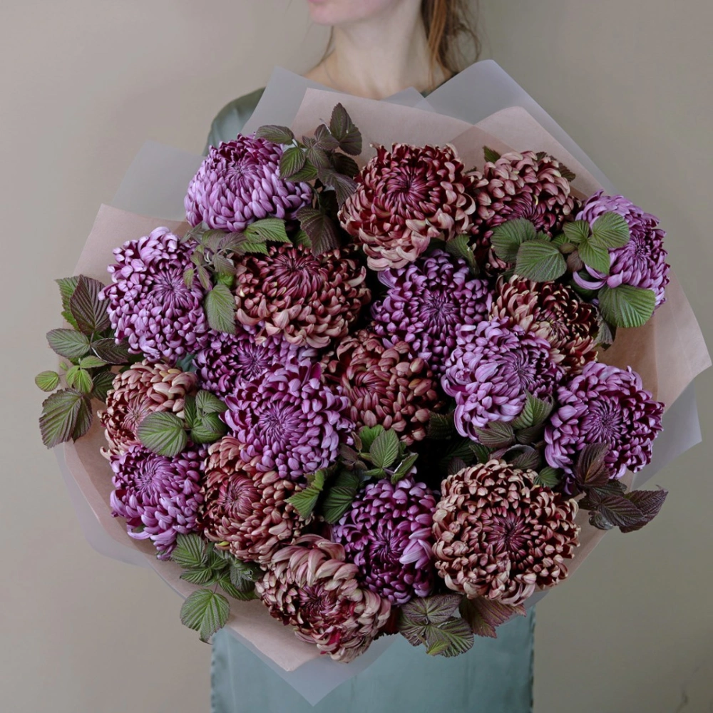 Букет из фиолетовых и кофейных шаровидных Хризантем. На фотографии букет из19 хризантем. Вы можете выбрать любое количество цветов указанное в перечне к данному букету.