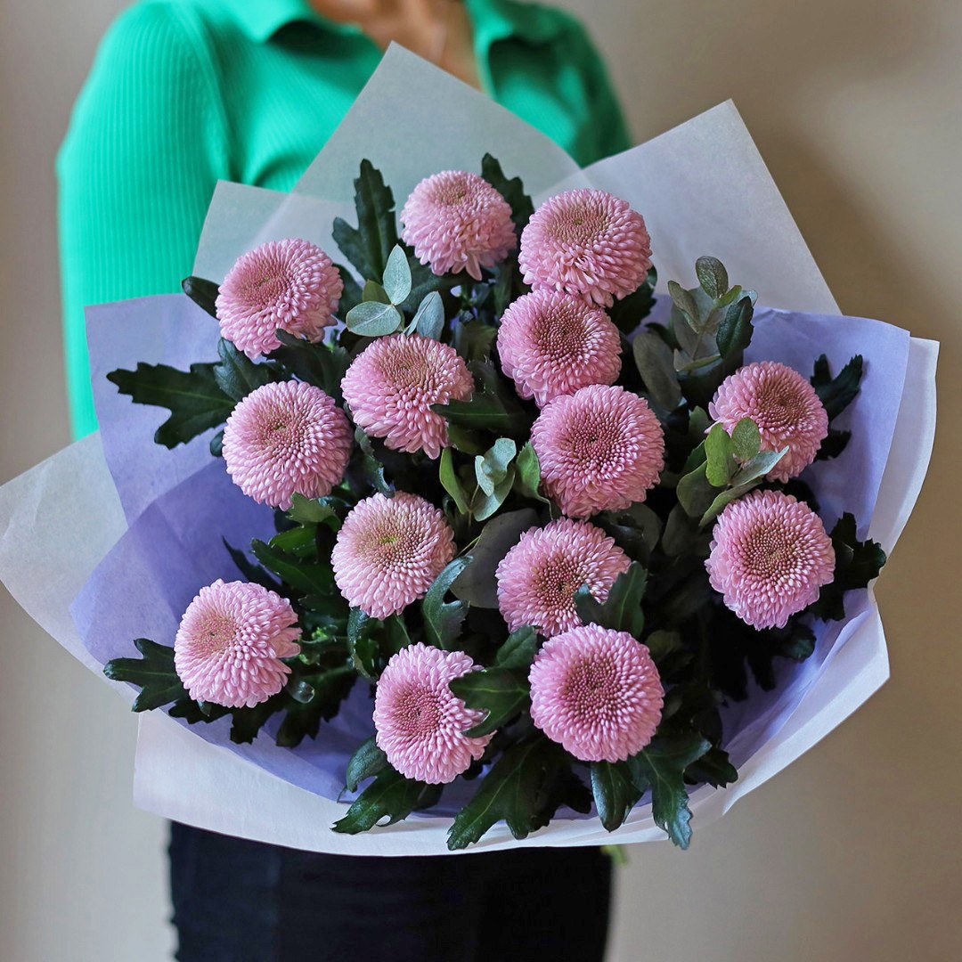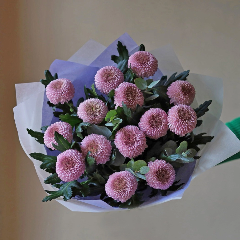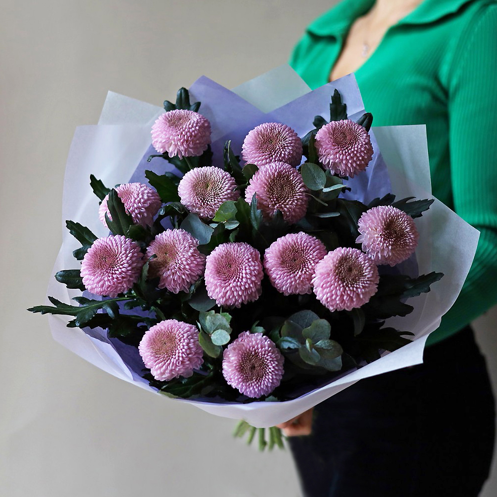 Букет из одноголовых хризантем лавандового цвета. Вы можете выбрать любое количество цветов указанное в перечне к данному букету.