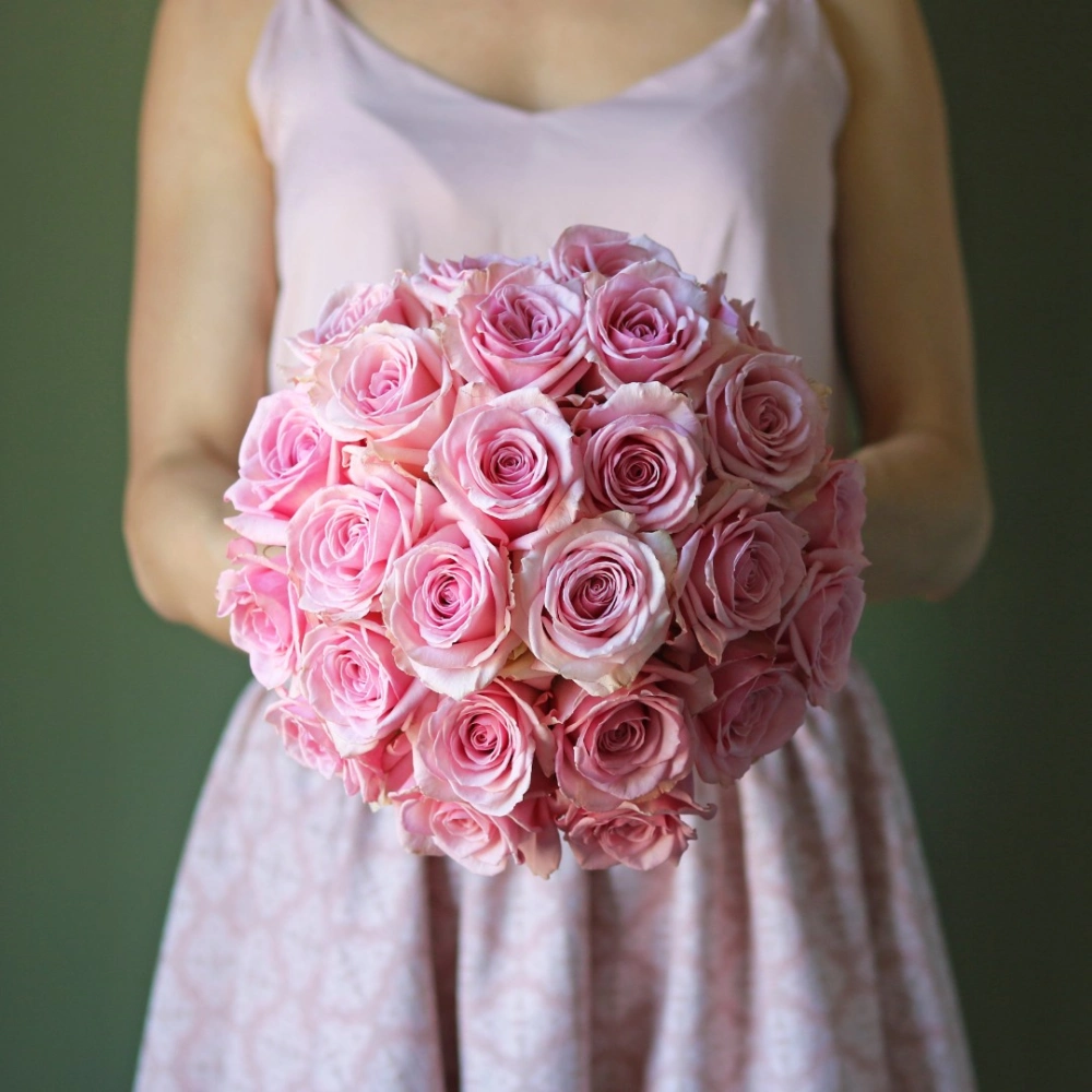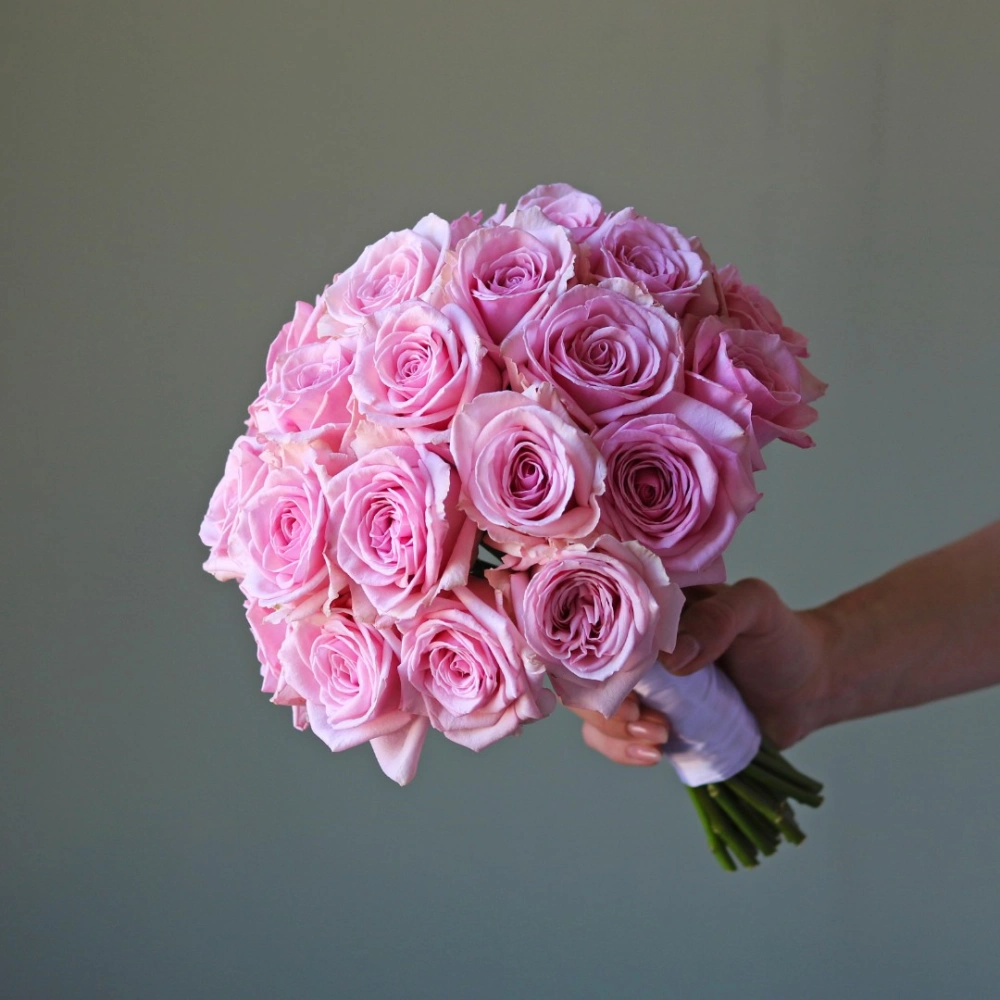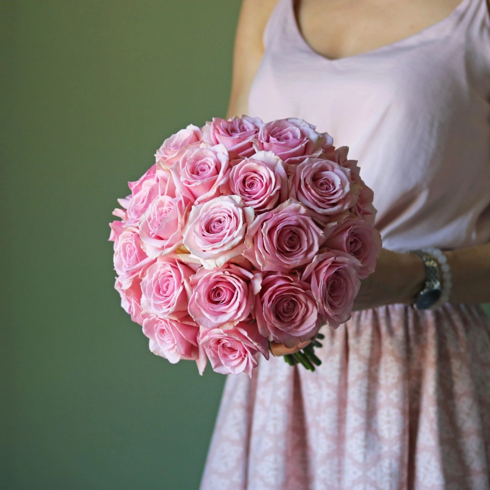 Букет невесты из розовых роз. Свадебный букет классической круглой формы в розовом цвете. Ножка букета декорирована атласными лентами.