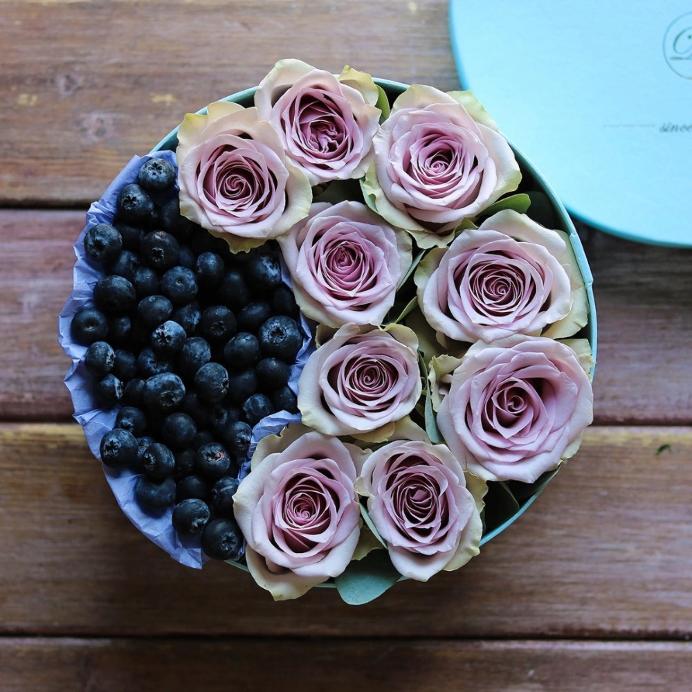 Авторские цветочные композиции в элегантных коробках различных форм, цветов, размеров, с добавлением сладостей в виде: баночки меда peroni, французских пирожных macarons, имбирных пряников и свежих ягод.