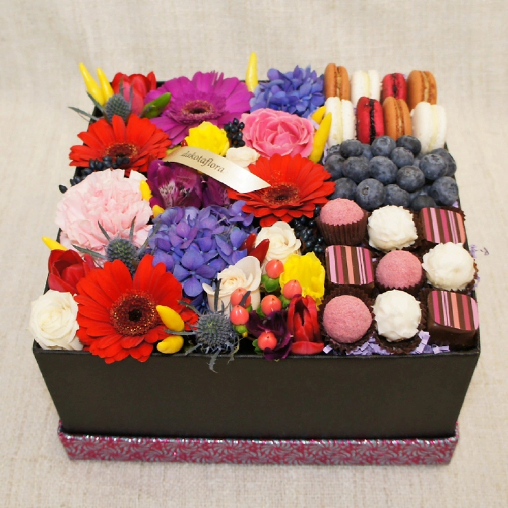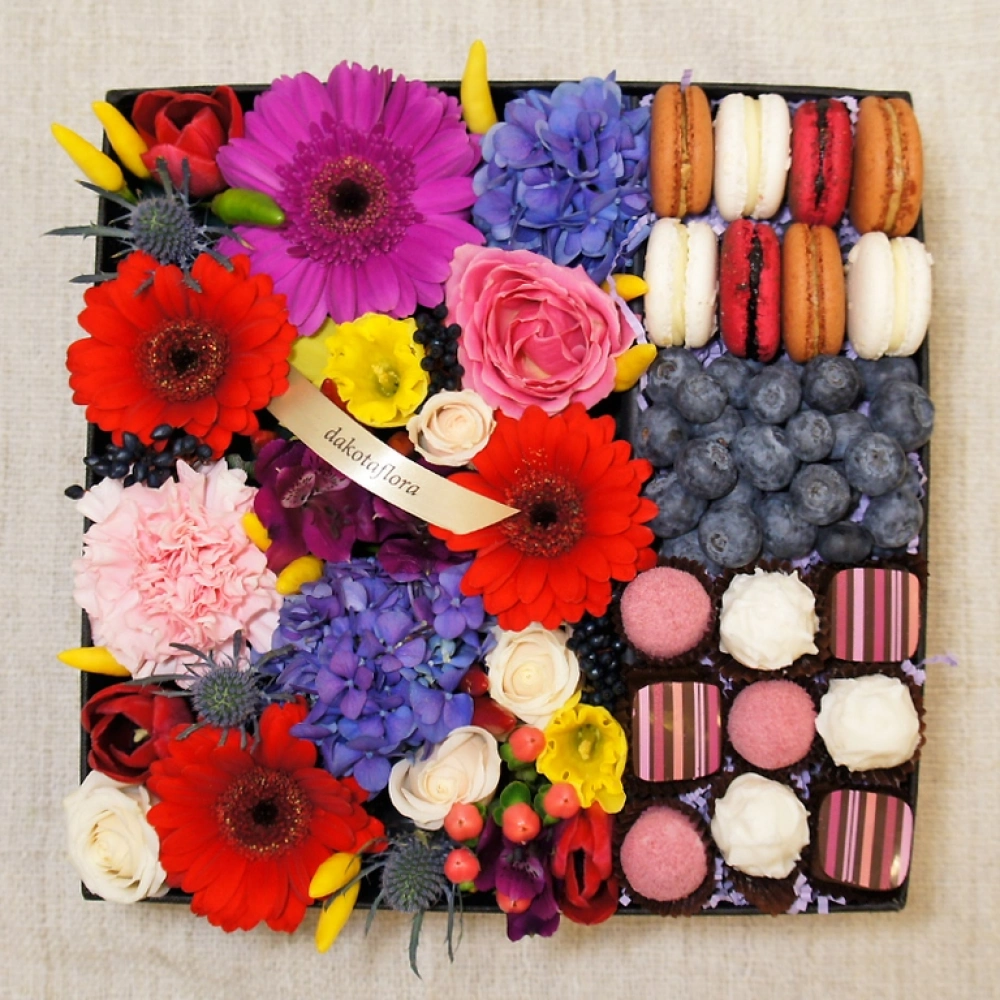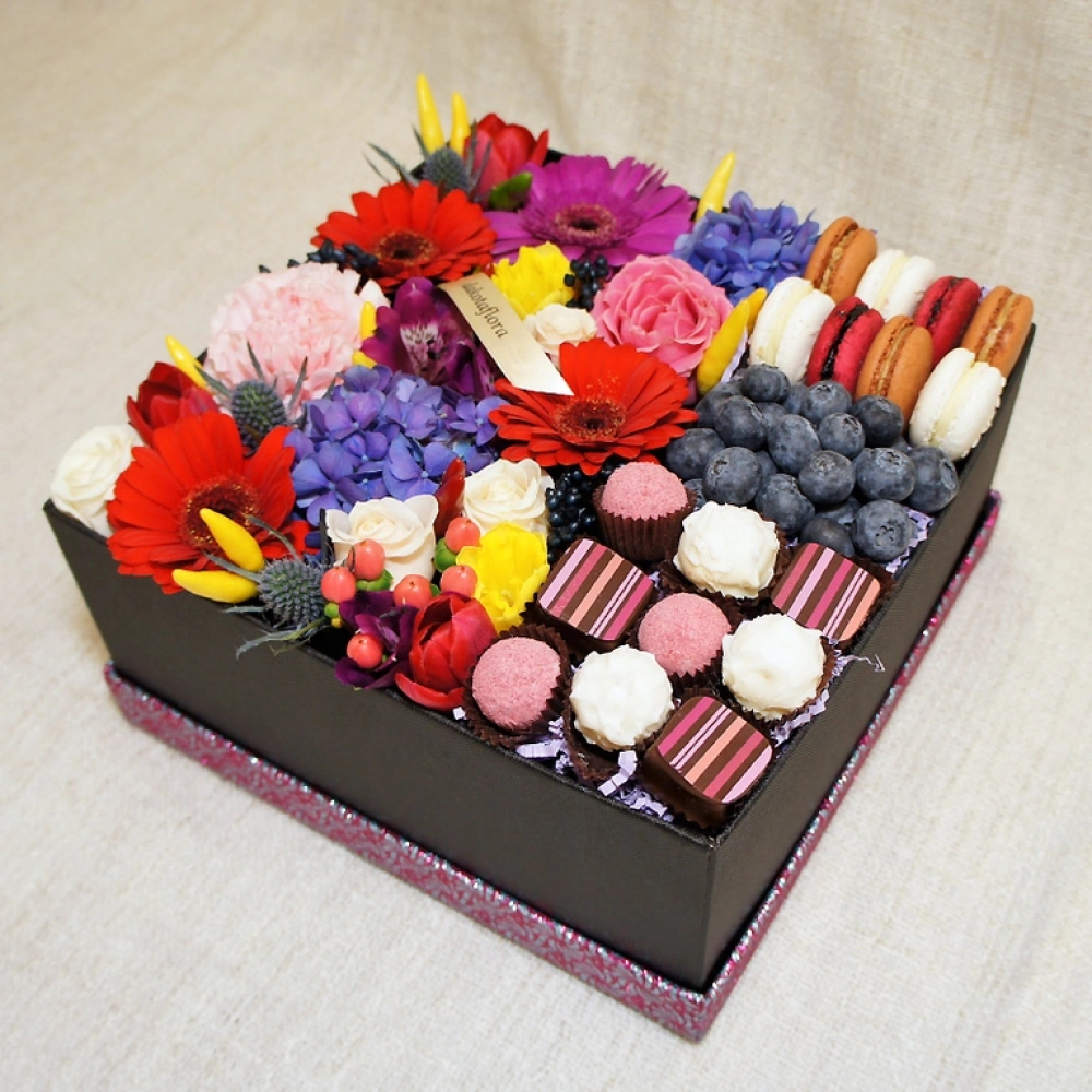 Авторские цветочные композиции в элегантных коробках различных форм, цветов, размеров, с добавлением сладостей в виде: французских пирожных macarons, свежих ягод и конфет ручной работы.