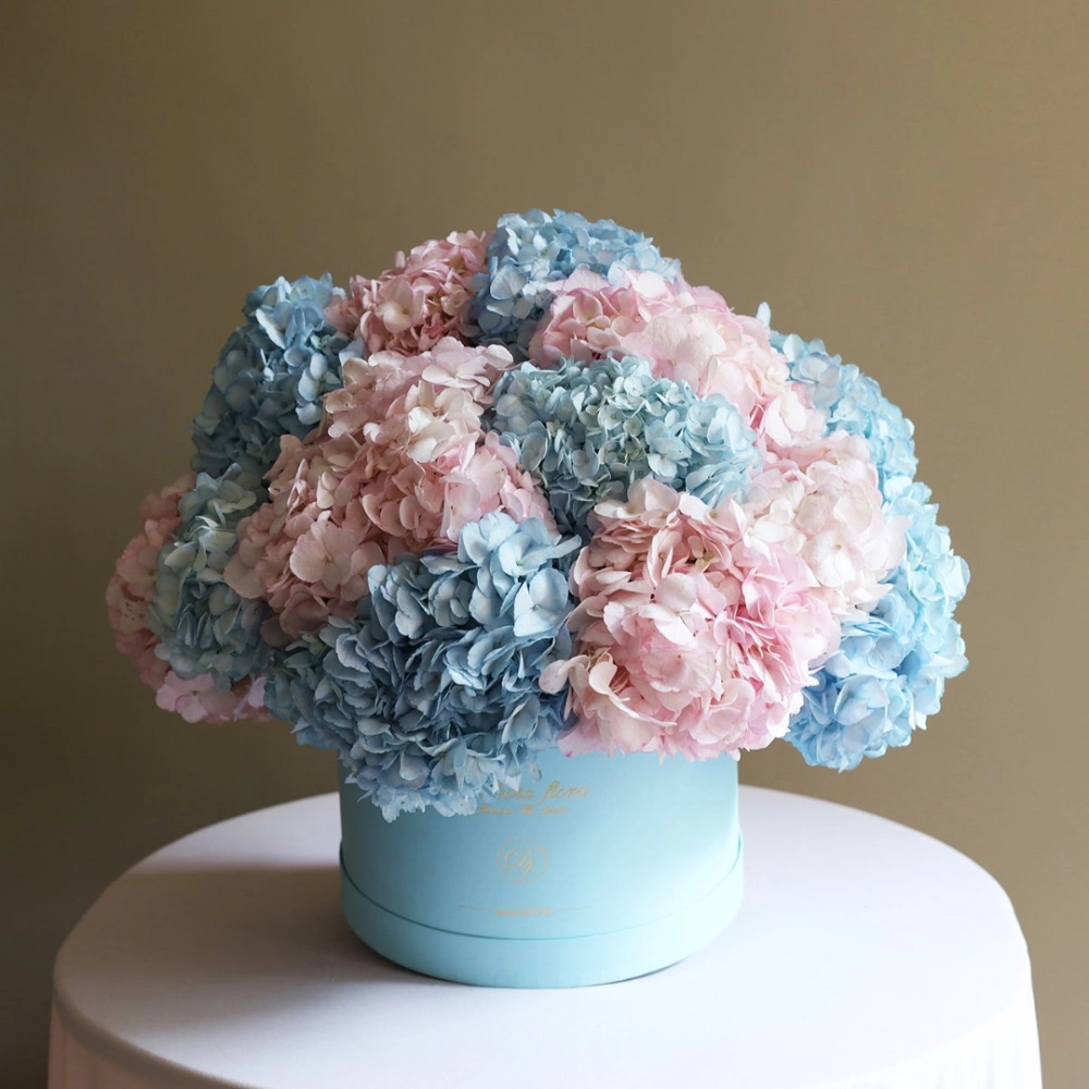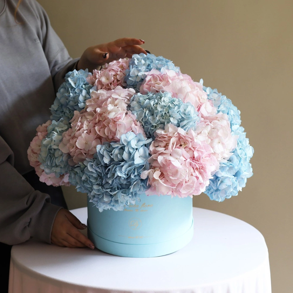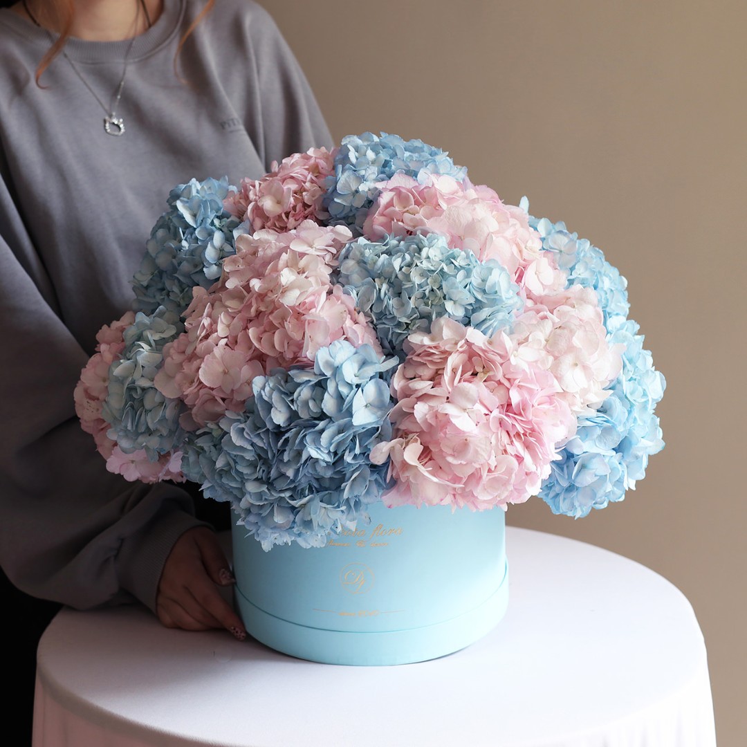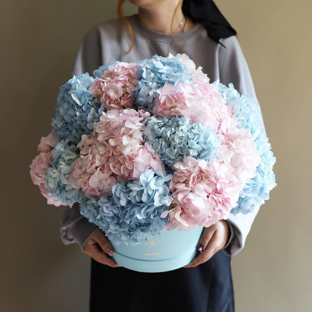 На фотографии 15 гортензий в коробке. Цветы в коробках это композиции, составленные с использованием специальной губки Oasis (пиафлор) которая пропитана водой. Для того чтобы цветы дольше оставались свежими, добавляйте в нее немного воды каждый день.