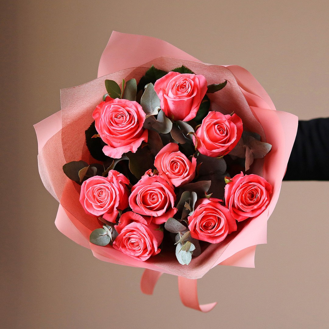 Букет из коралловых роз с зеленью эвкалипта. Вы можете выбрать любое количество роз, указанное в перечне к данному букету.