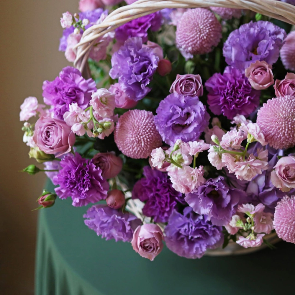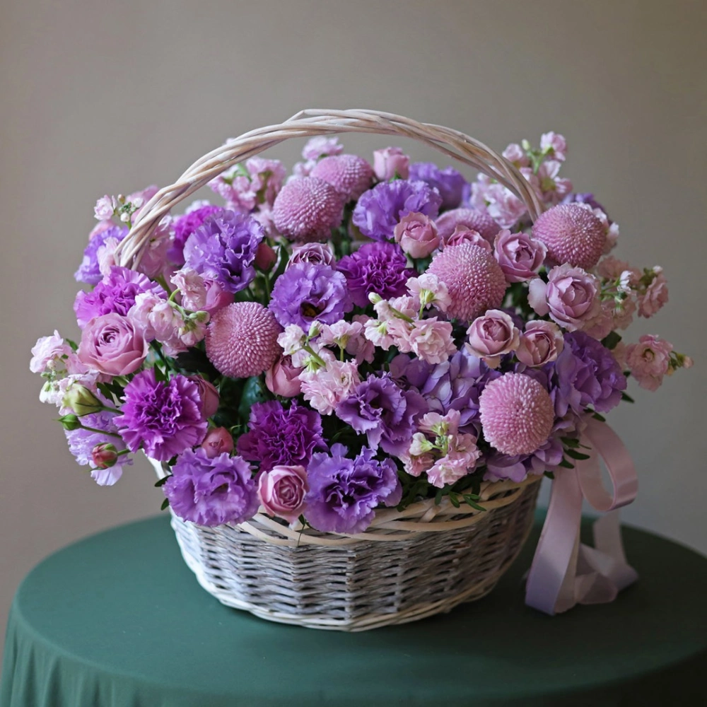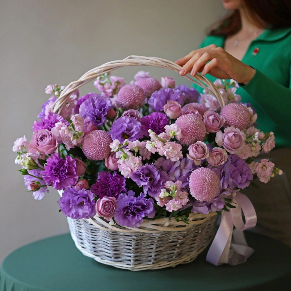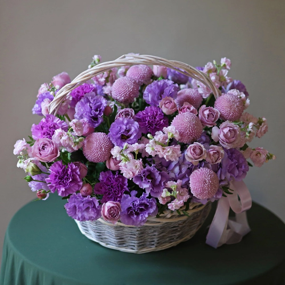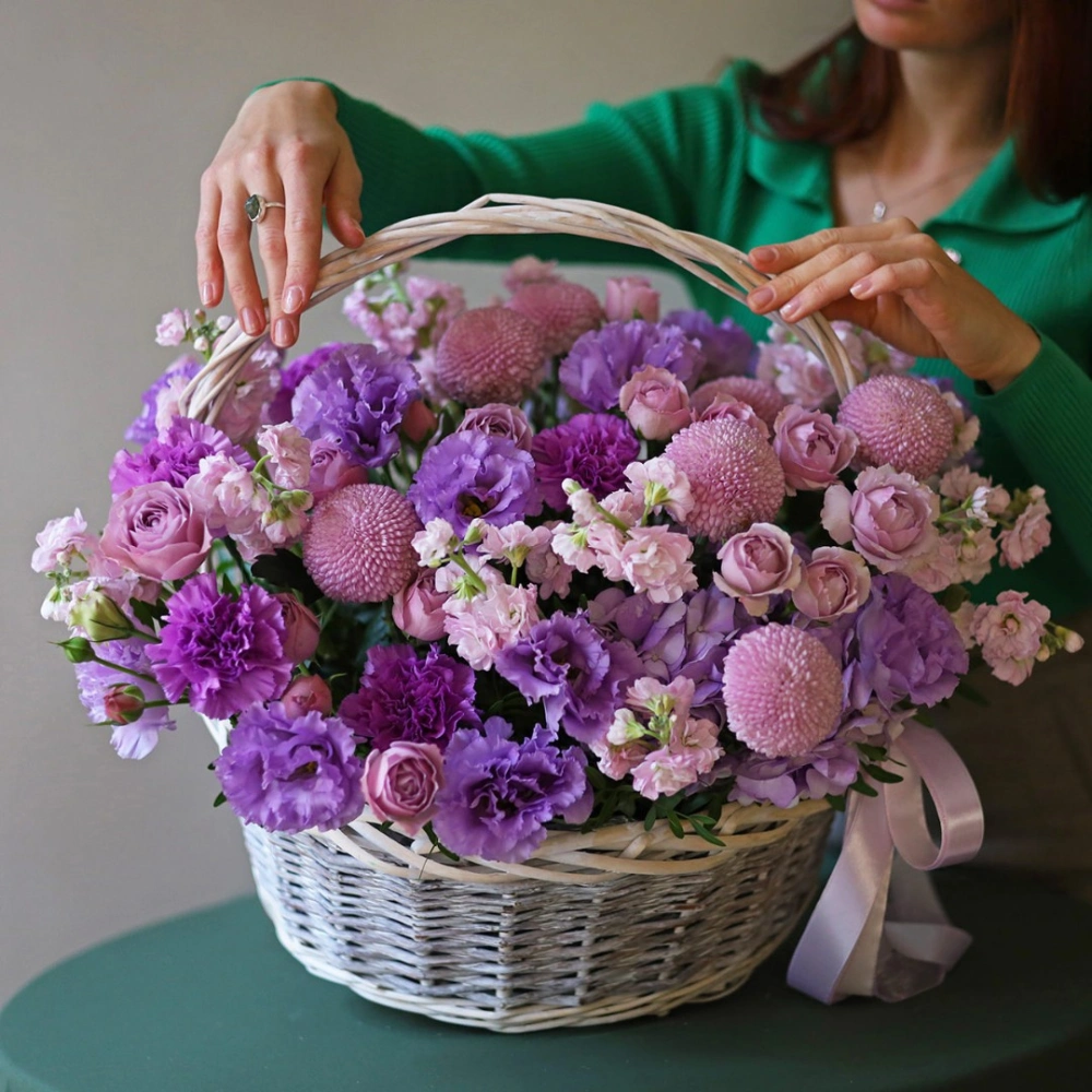 Корзина с цветами от интернет-магазина Дакота флора - это настоящий шедевр цветочного искусства. В ней собраны самые изысканные и красивые цветы, которые привлекают внимание своей неповторимой красотой и ароматом. Розы, маттиола, эустома, гортензия, хризантема момокко - каждый цветок в этой корзине является уникальным и прекрасным. Они гармонично сочетаются друг с другом, создавая неповторимую атмосферу уюта и тепла.