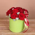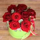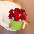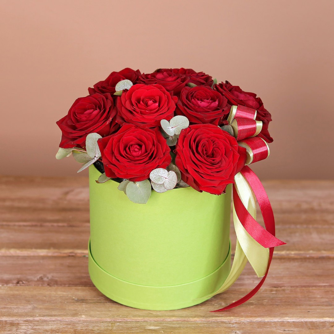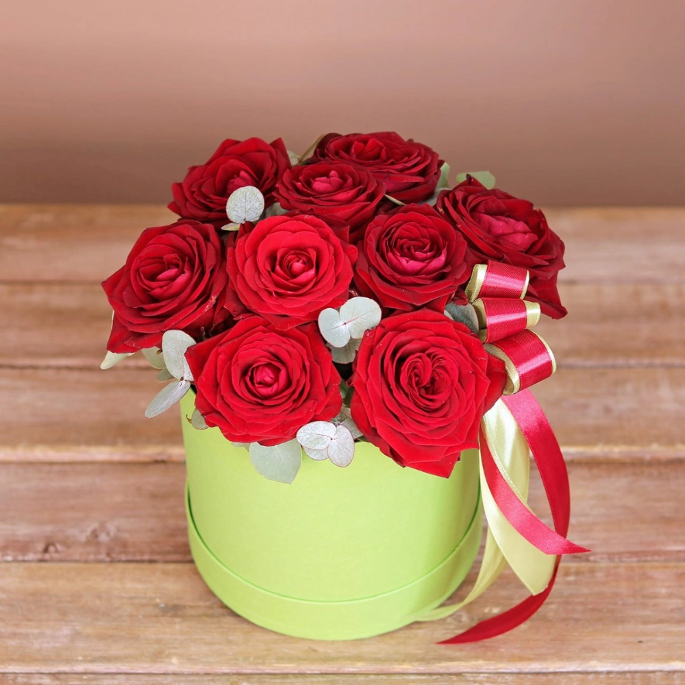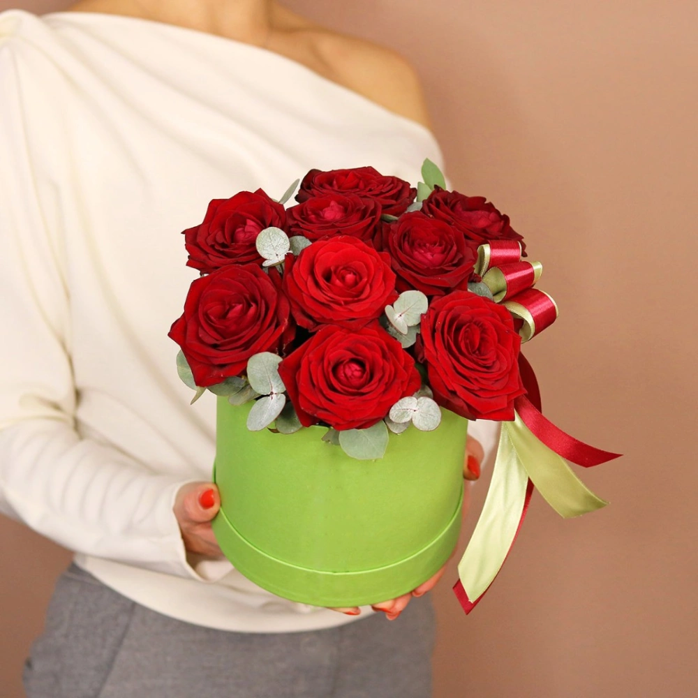 Красные розы с эвкалиптом в шляпной коробке