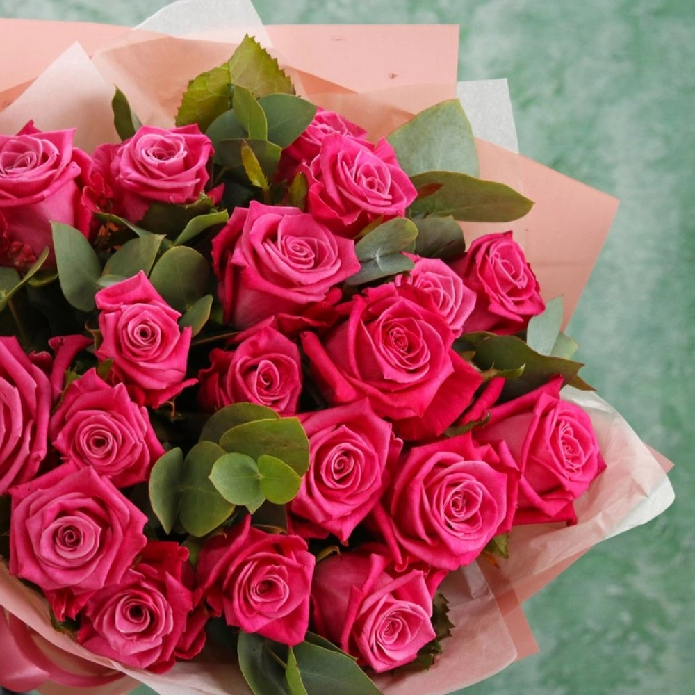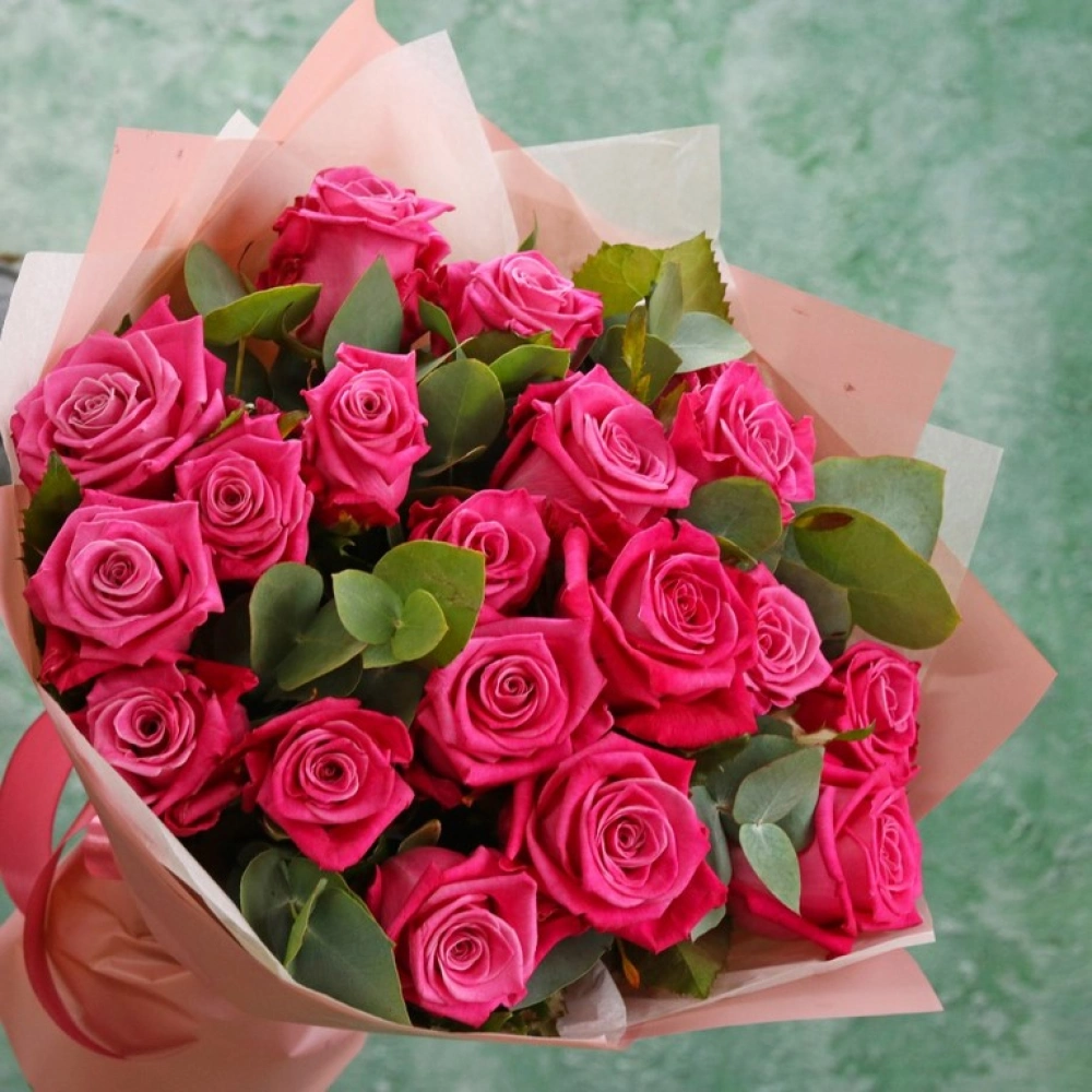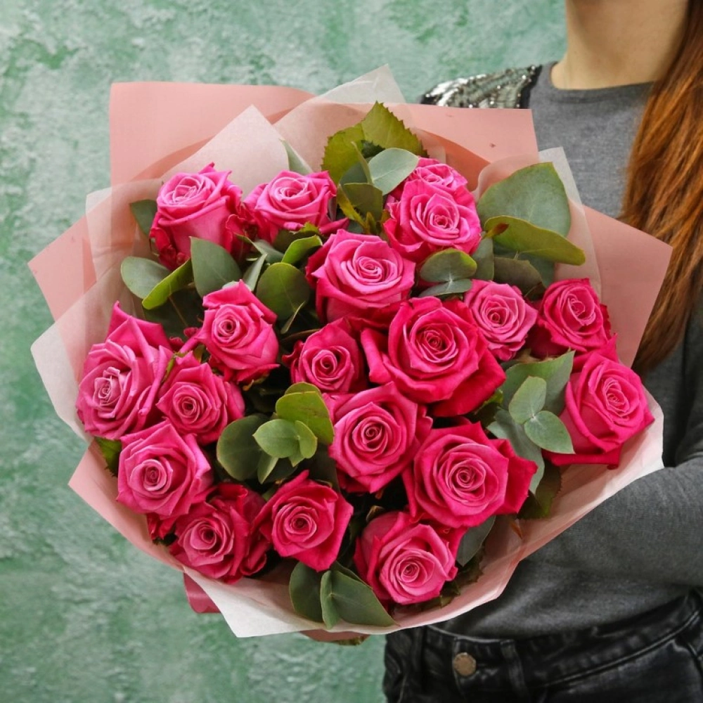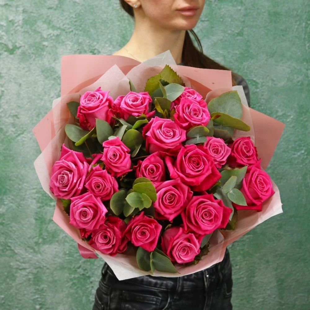 Букет из малиновых роз с эвкалиптом. Вы можете выбрать любое количество цветов указанное в перечне к данному букету.
