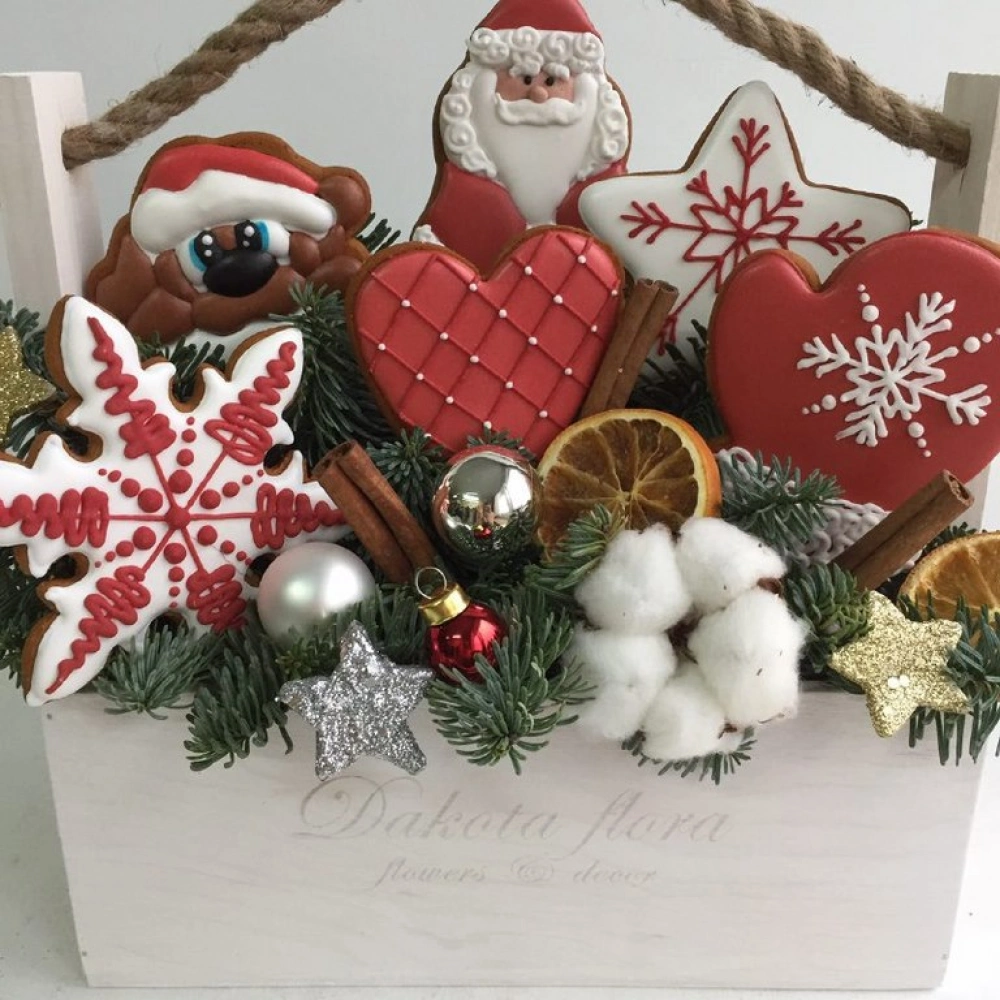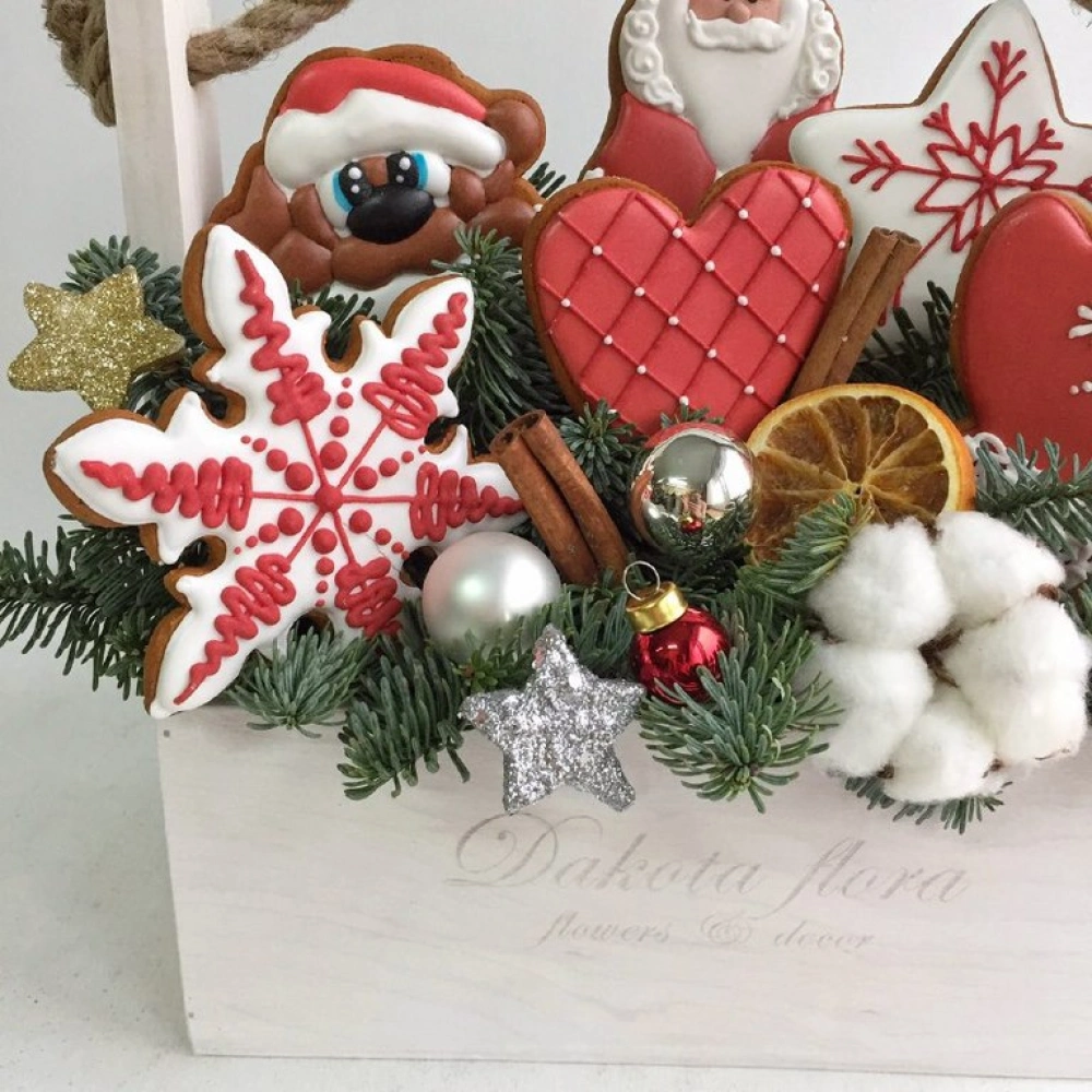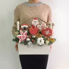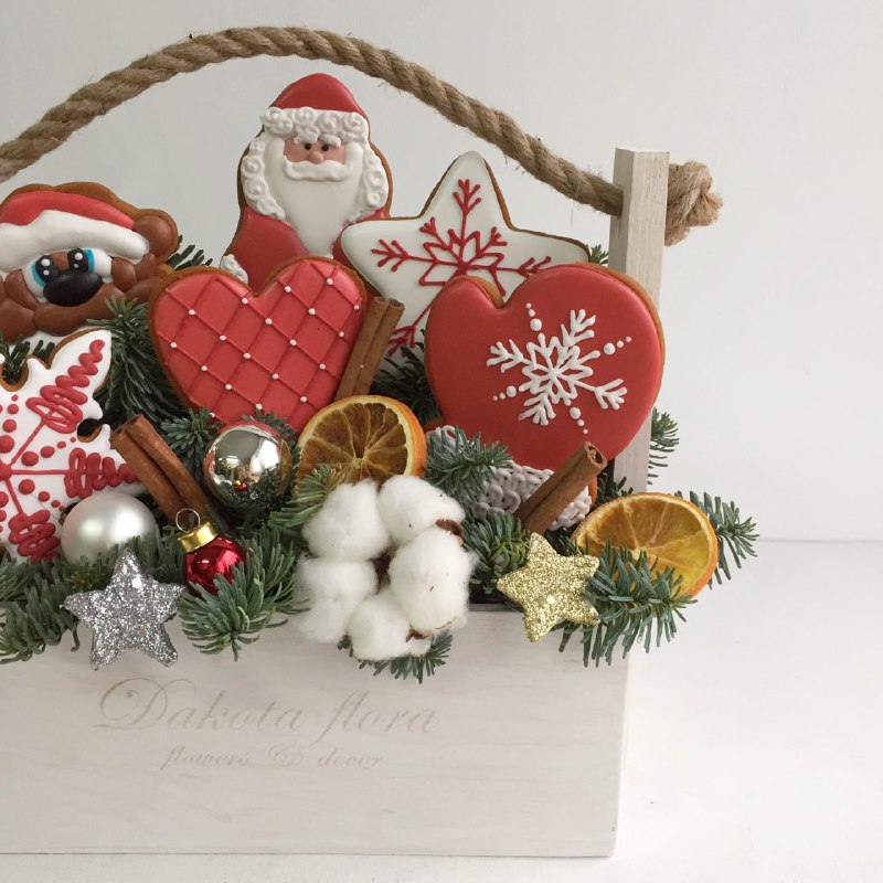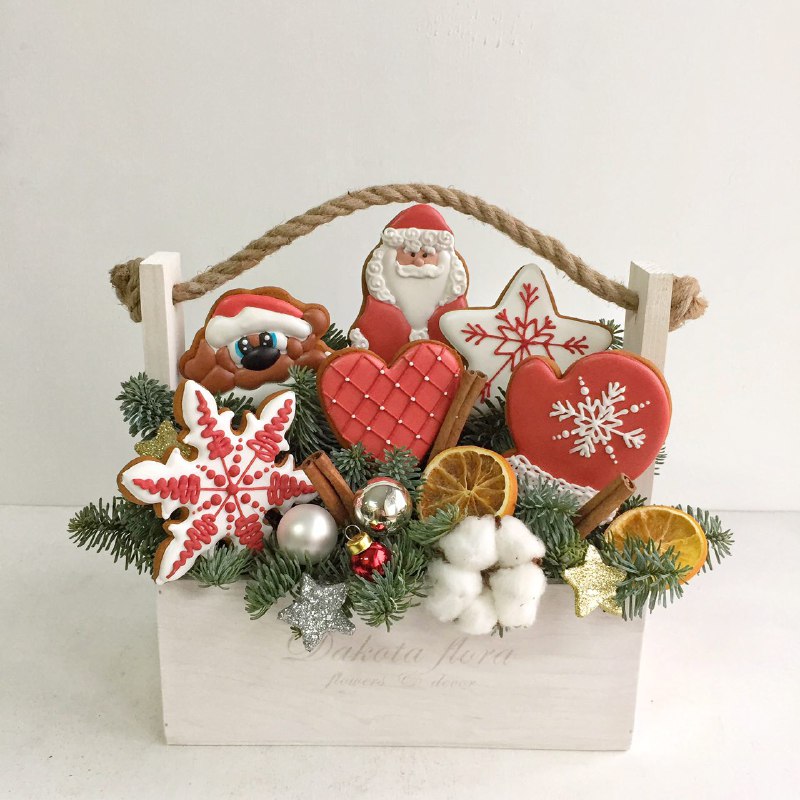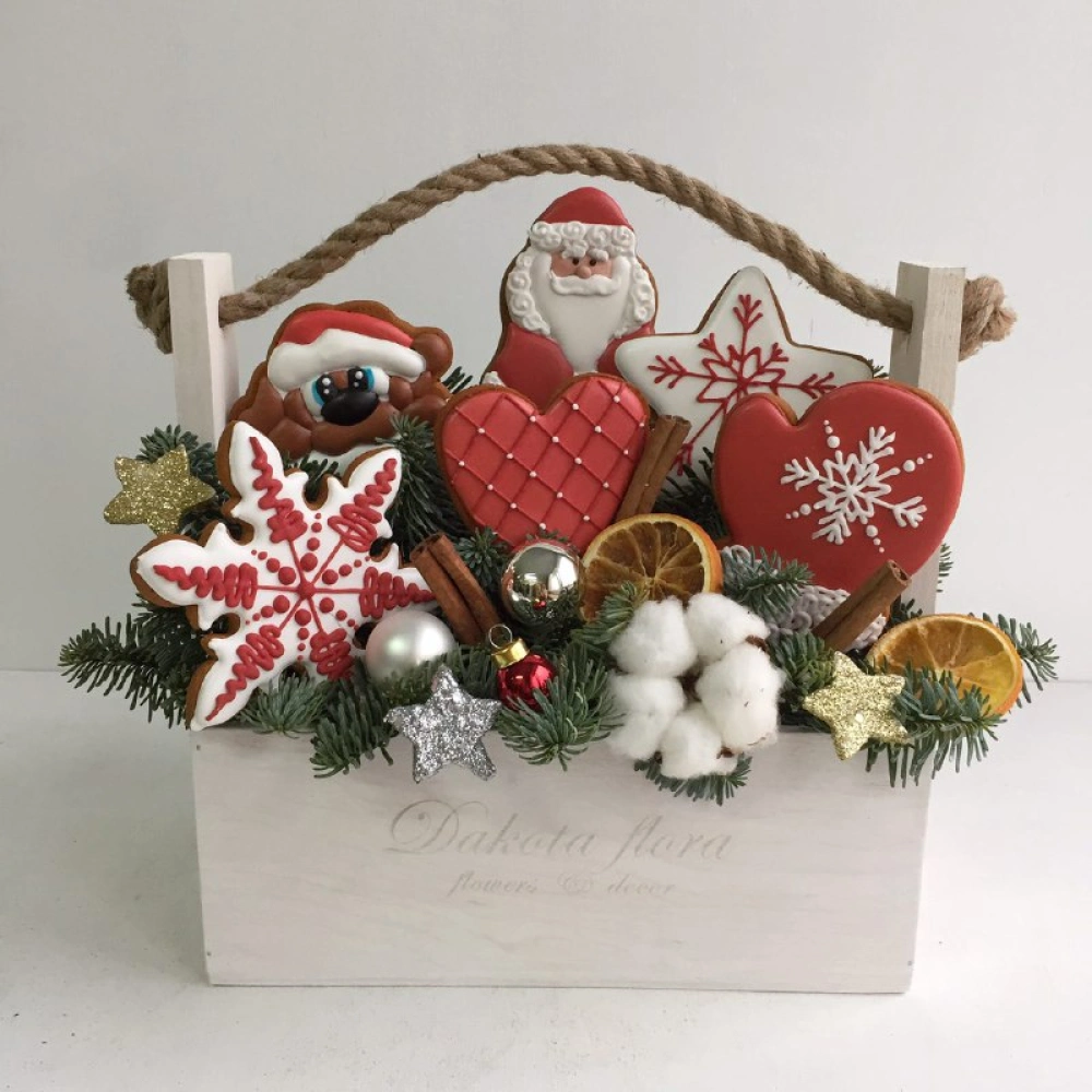 Очаровательный деревянный ящичек с традиционным зимним угощением - ароматными имбирными пряниками, расписанными в новогодней тематике - чудесный подарок для родных и друзей. Такие пряники обязательно порадуют и детей и взрослых, они расположены на "подушке" из натуральной ели, украшенной небольшими игрушками.