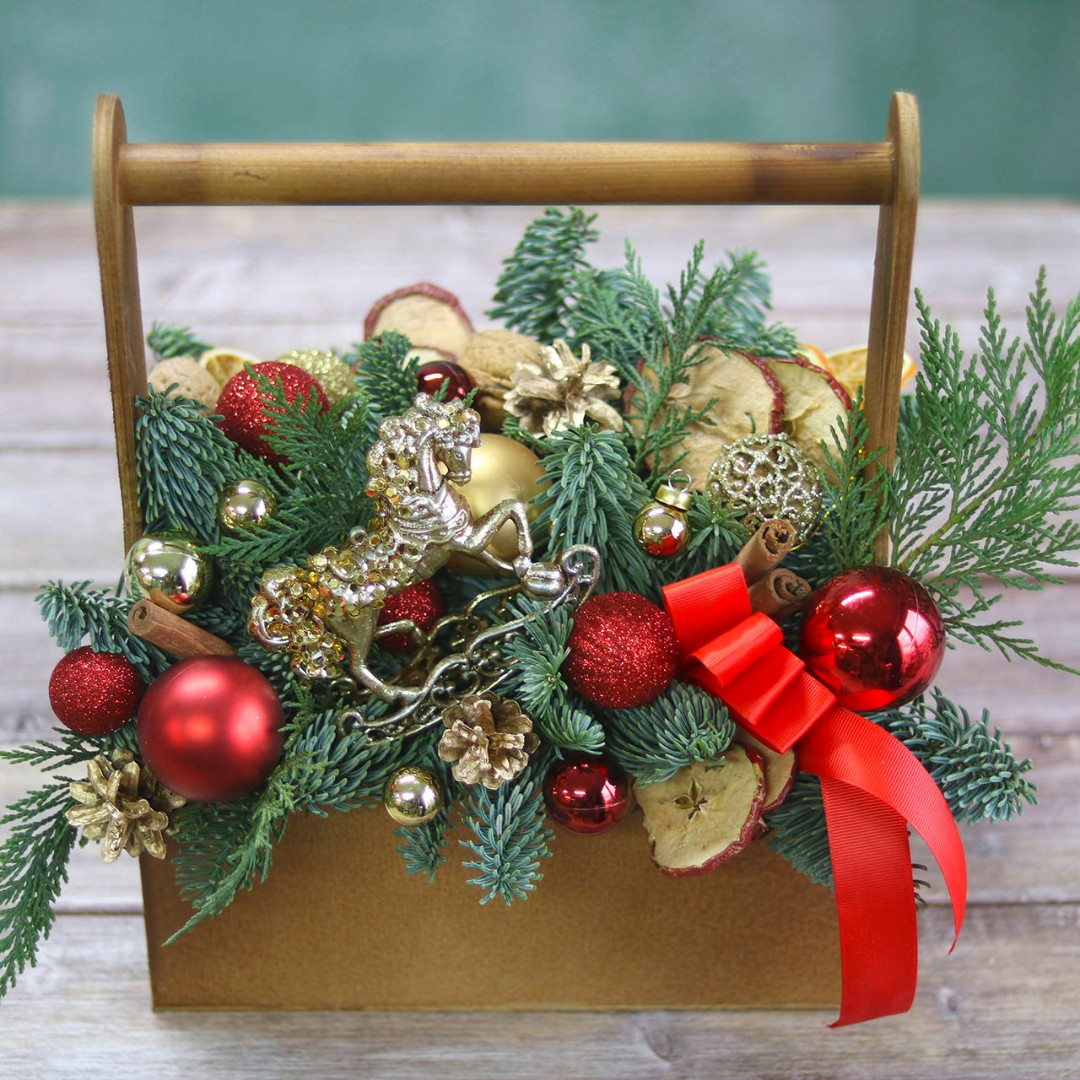 Оформить заказ на новогоднюю композицию лучше заранее, минимум за сутки, на изготовление и подбор декора требуется время. Композиция выполнена из натуральной ели (лапник), собрана на специальной губке, которая пропитана водой, это позволяет сохранить свежий внешний вид на максимально долгий срок.