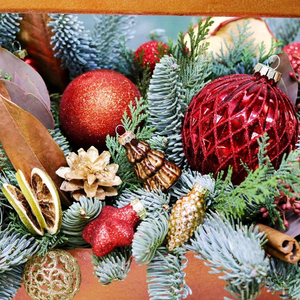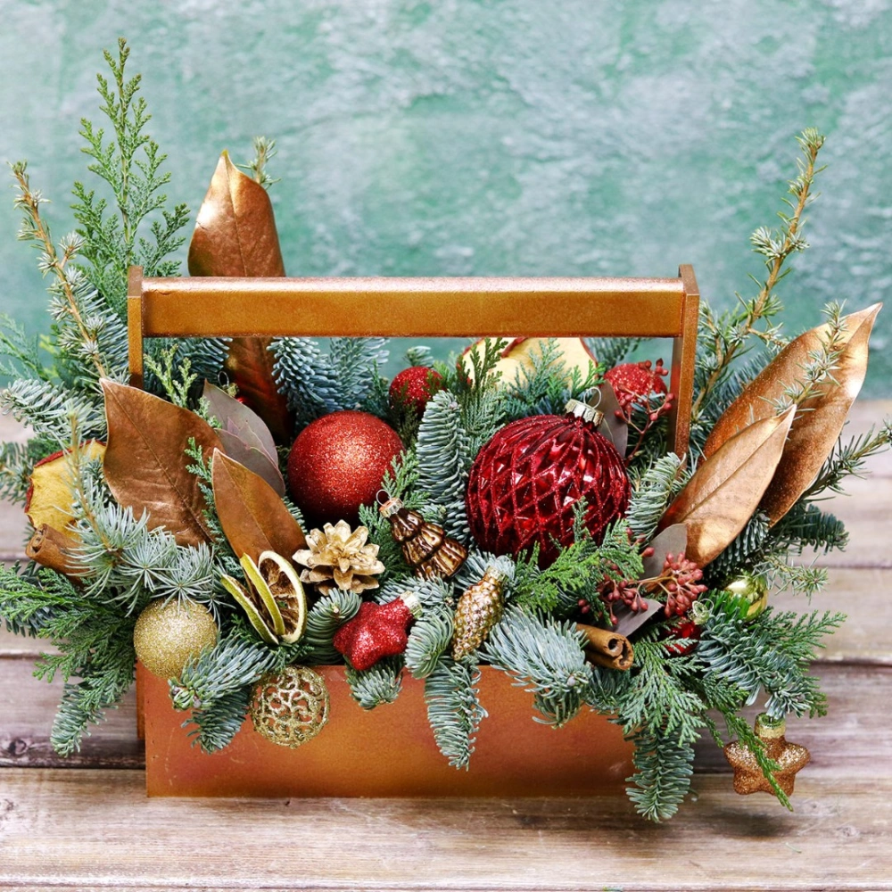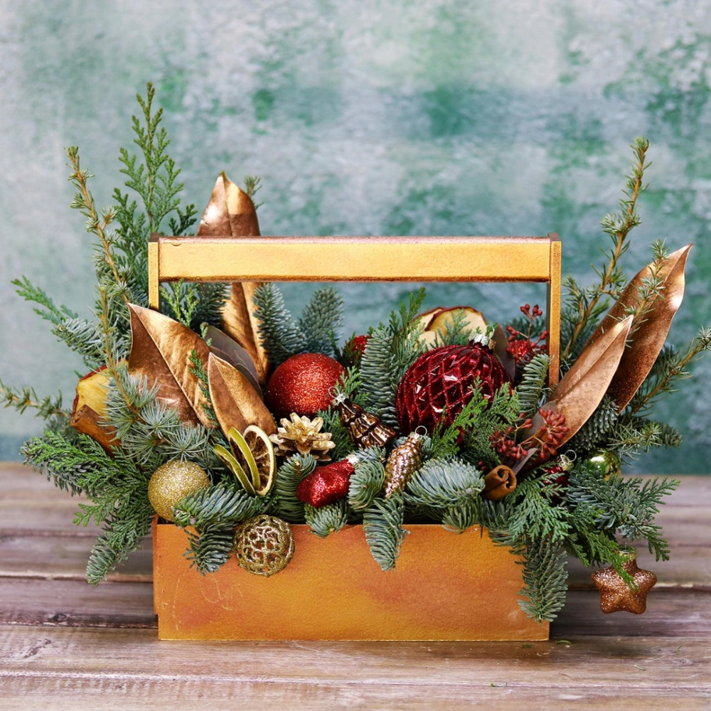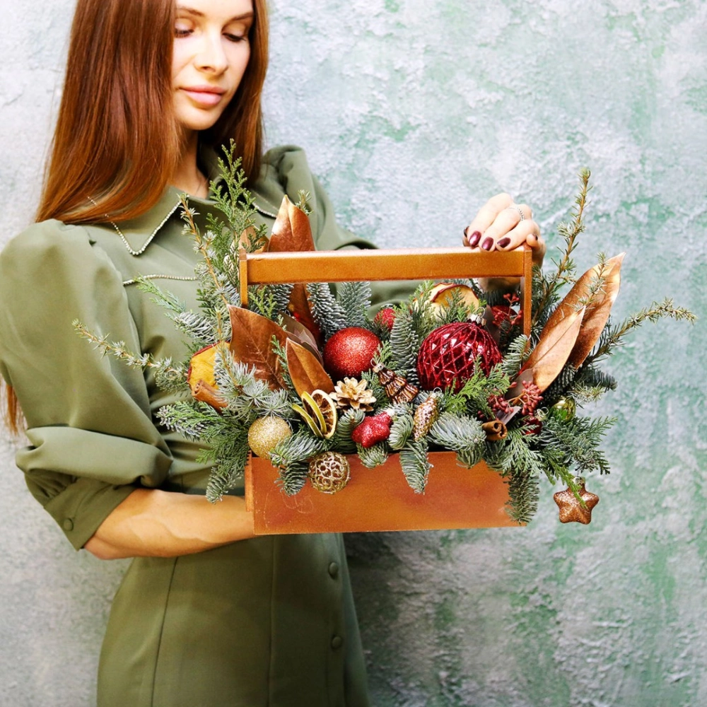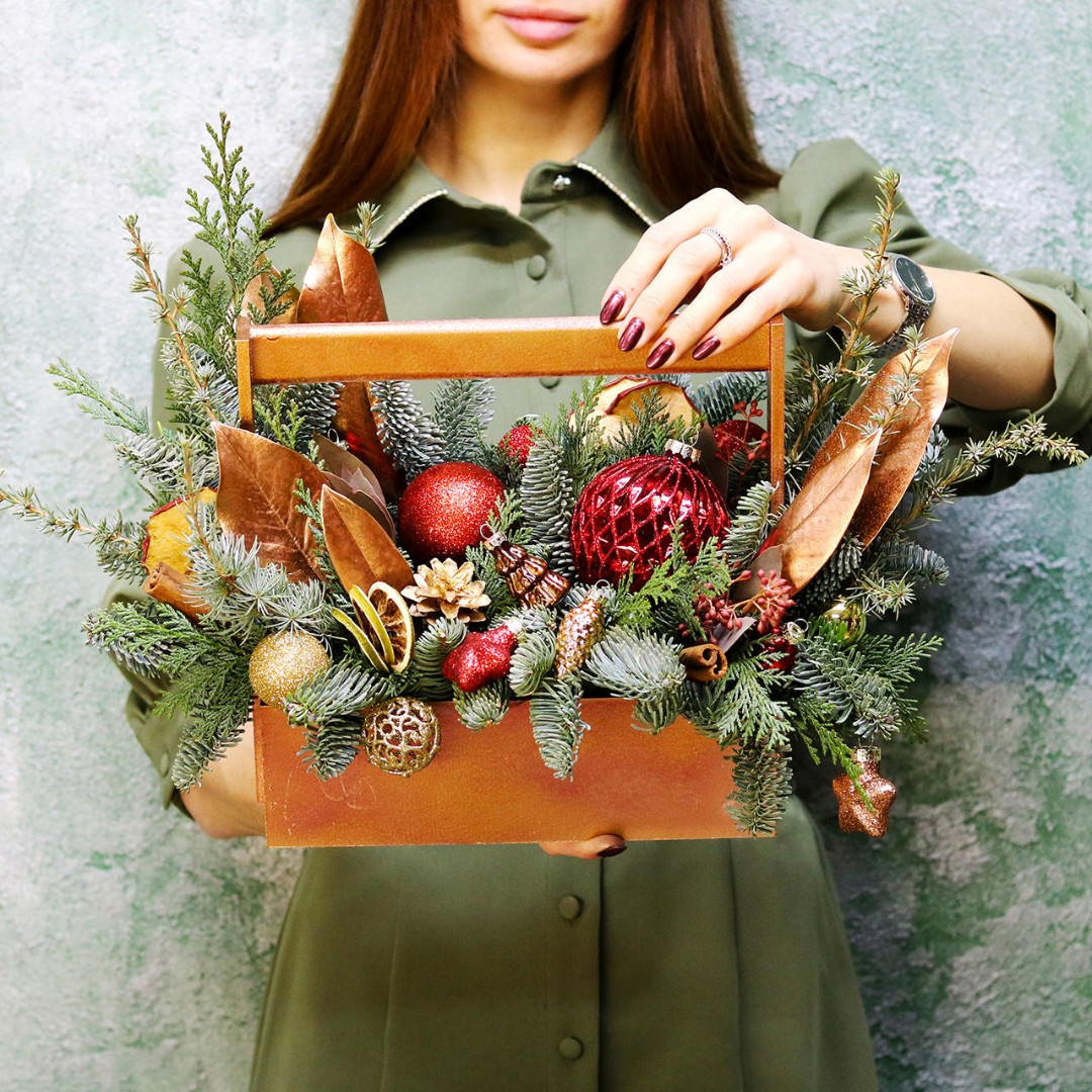 Деревянный ящик с новогодним декором - чудесный подарок для родных и друзей. Авторская новогодняя композиция из натуральной ели, выполненная в деревянном ящике прямоугольной формы. Этот подарок станет прекрасным украшением в домашнем интерьере и будет радовать получателя долгое время. Композиция выполнена на специальной флористической губке, она пропитана водой, это позволяет хвои максимально долго сохранять свою свежесть.
