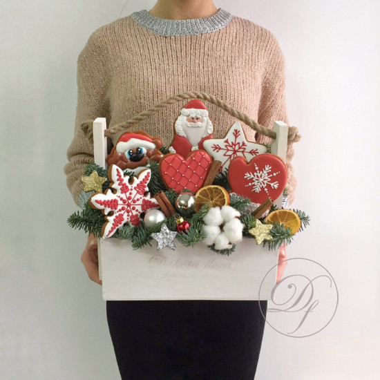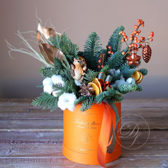 Деревянный ящик с новогодним декором - чудесный подарок для родных и друзей. Авторская новогодняя композиция из натуральной ели, выполненная в деревянном ящике прямоугольной формы. Этот подарок станет прекрасным украшением в домашнем интерьере и будет радовать получателя долгое время. Композиция выполнена на специальной флористической губке, она пропитана водой, это позволяет хвои максимально долго сохранять свою свежесть.