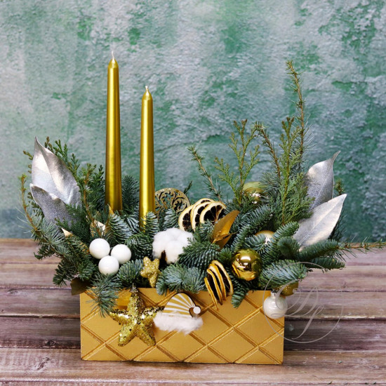 Оформить заказ на композицию из ели, лучше заранее, минимум за сутки, для изготовления и подбора декора требуется время. Композиция выполнена из натуральной ели (лапник), собрана на специальной губке, которая пропитана водой, это позволяет сохранить свежий внешний вид на максимально долгий срок. Для украшения мы используем новогодний декор, натуральные материалы, свечи, гирлянды.