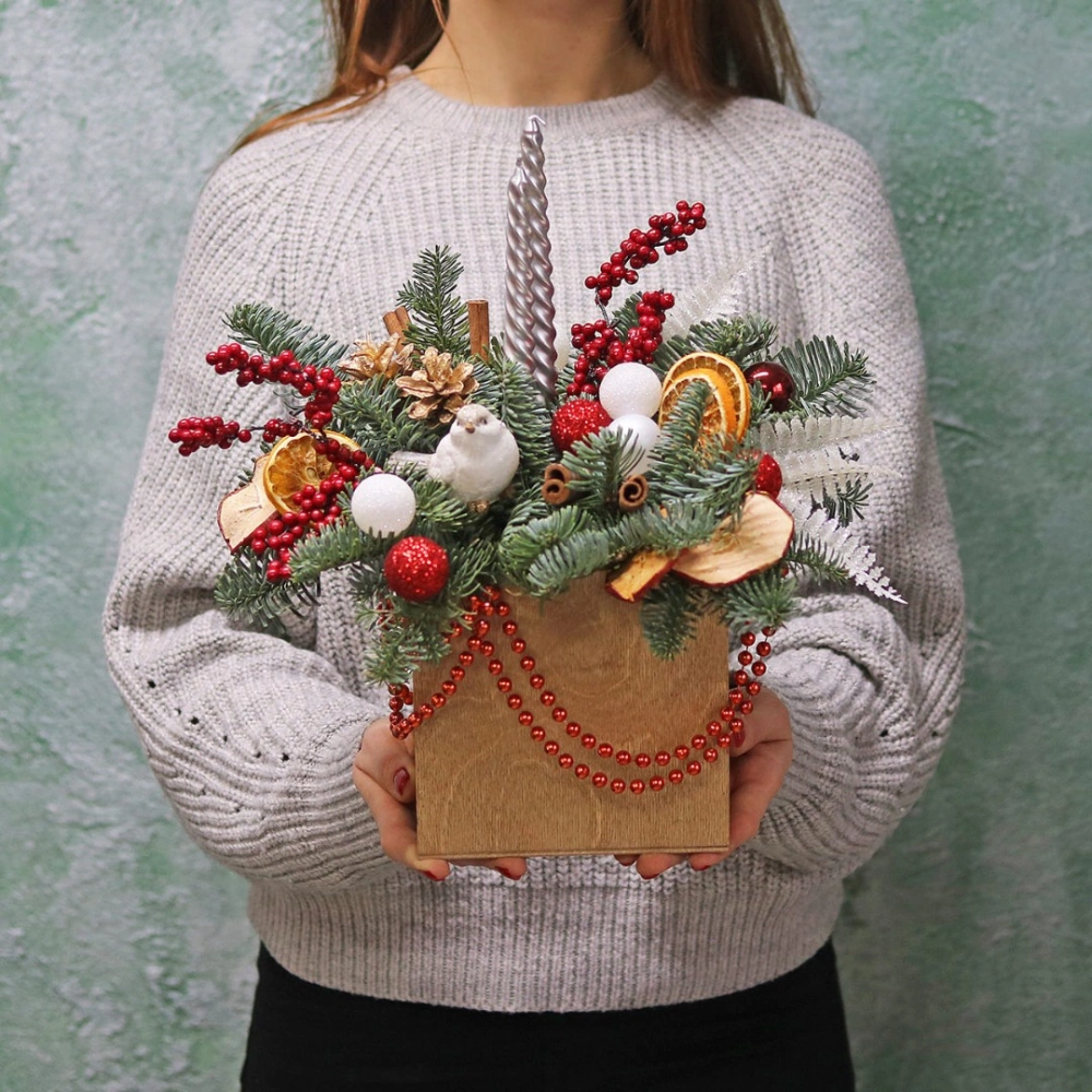 Композиция из натуральной ели хорошо подойдет для украшения дома или офиса. Размер композиции можно выбрать в карточке товара. Все композиции авторские и уникальные, каждая работа выполняется на заказ. Вы можете выбрать нужный Вам размер и рассказать нам о своих пожеланиях по дизайну.