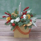 Новогодняя композиция хорошо подойдёт для подарка родным и близким. Для праздничного настроения, подарок можно сделать в канун нового года, или украсить ею праздничный стол.
