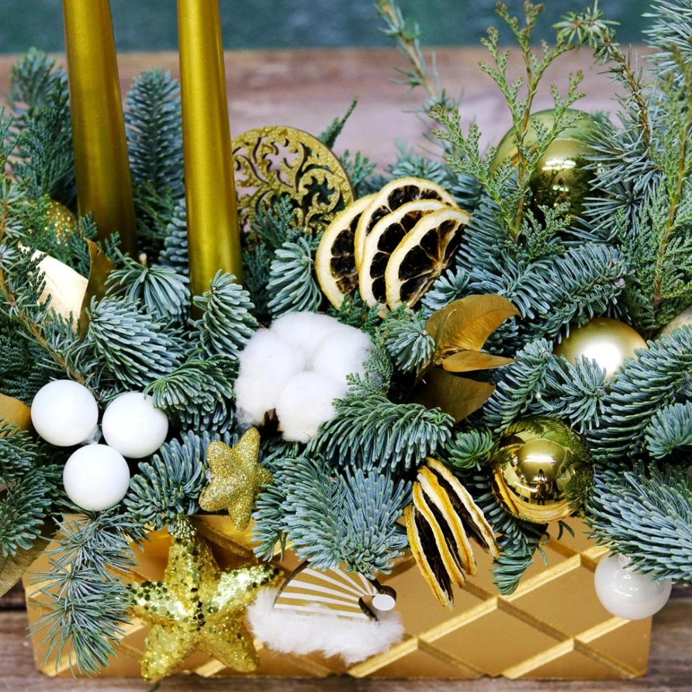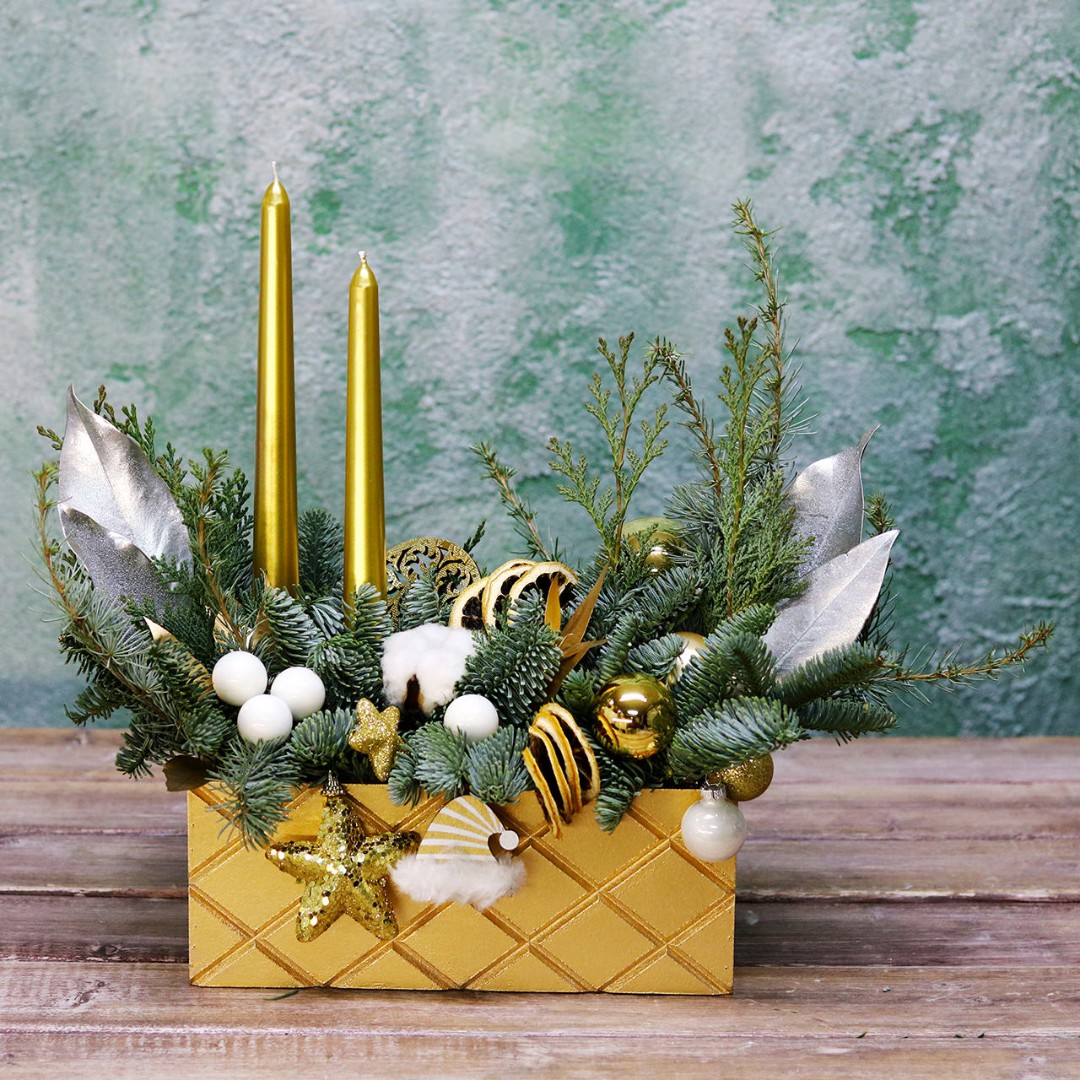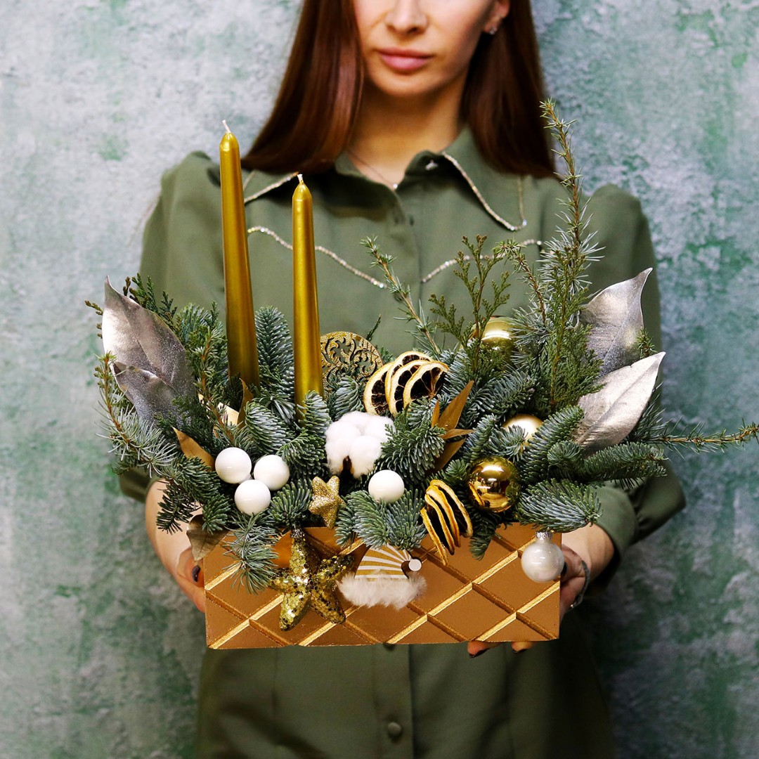 Деревянный ящик с новогодним декором - чудесный подарок для родных и друзей. Авторская новогодняя композиция из натуральной ели, выполненная в деревянном ящике прямоугольной формы. Этот подарок станет прекрасным украшением в домашнем интерьере и будет радовать получателя долгое время. Композиция выполнена на специальной флористической губке, она пропитана водой, это позволяет хвои максимально долго сохранять свою свежесть.