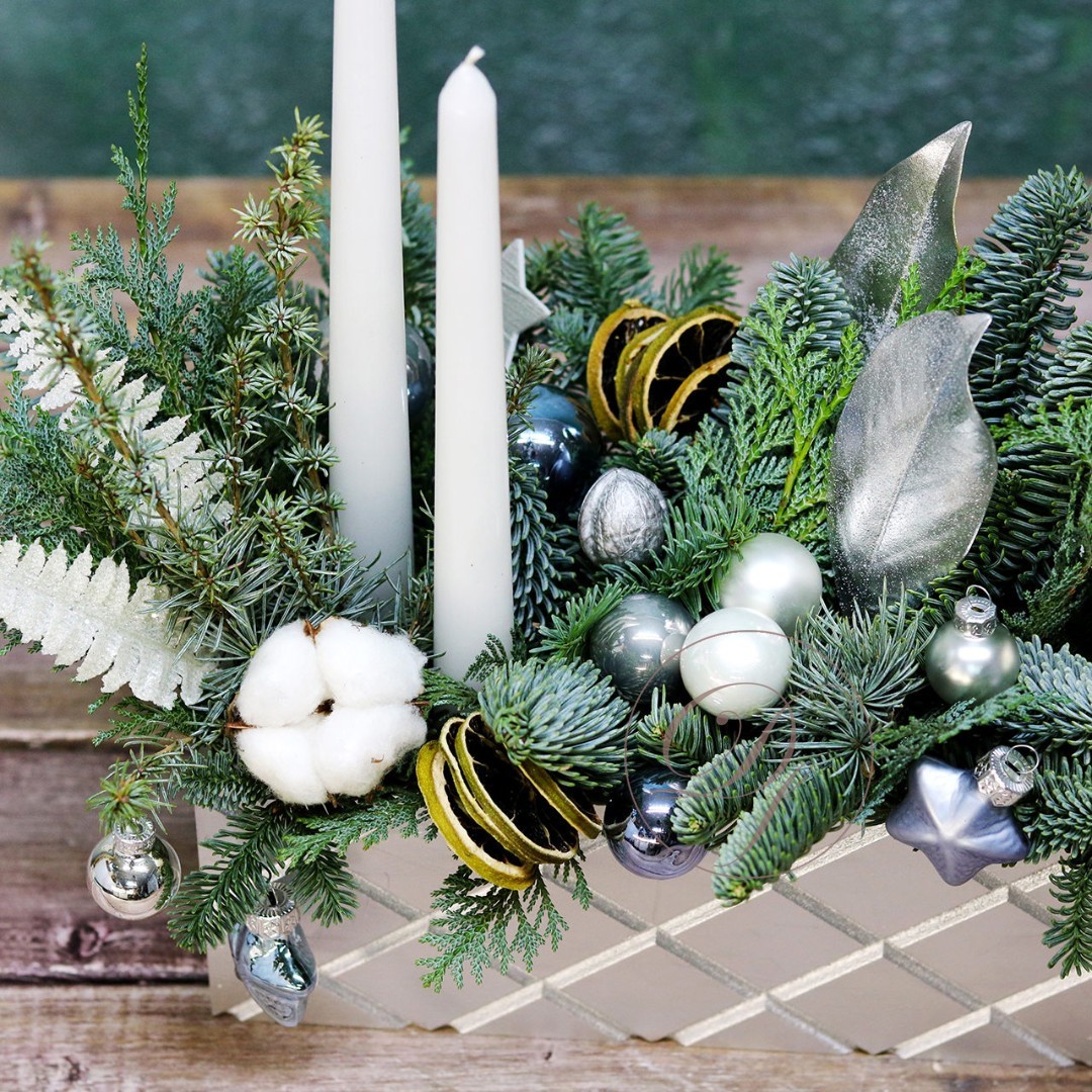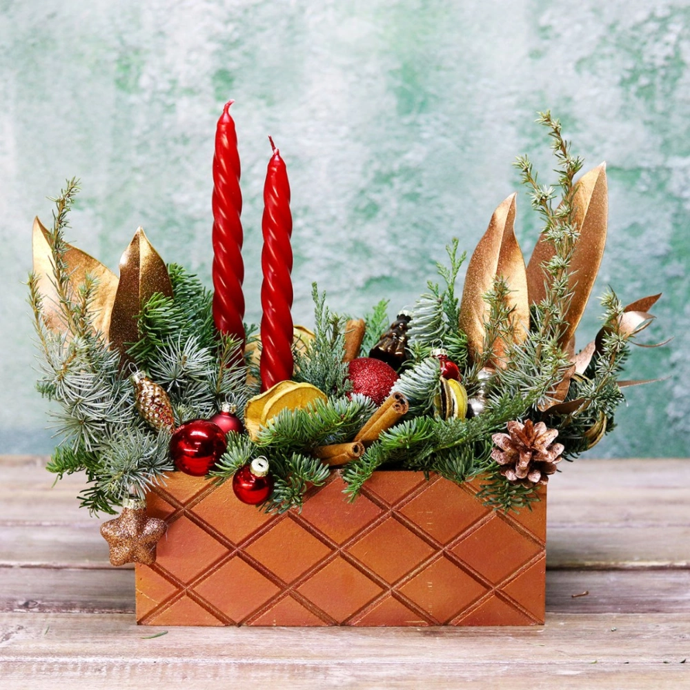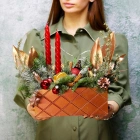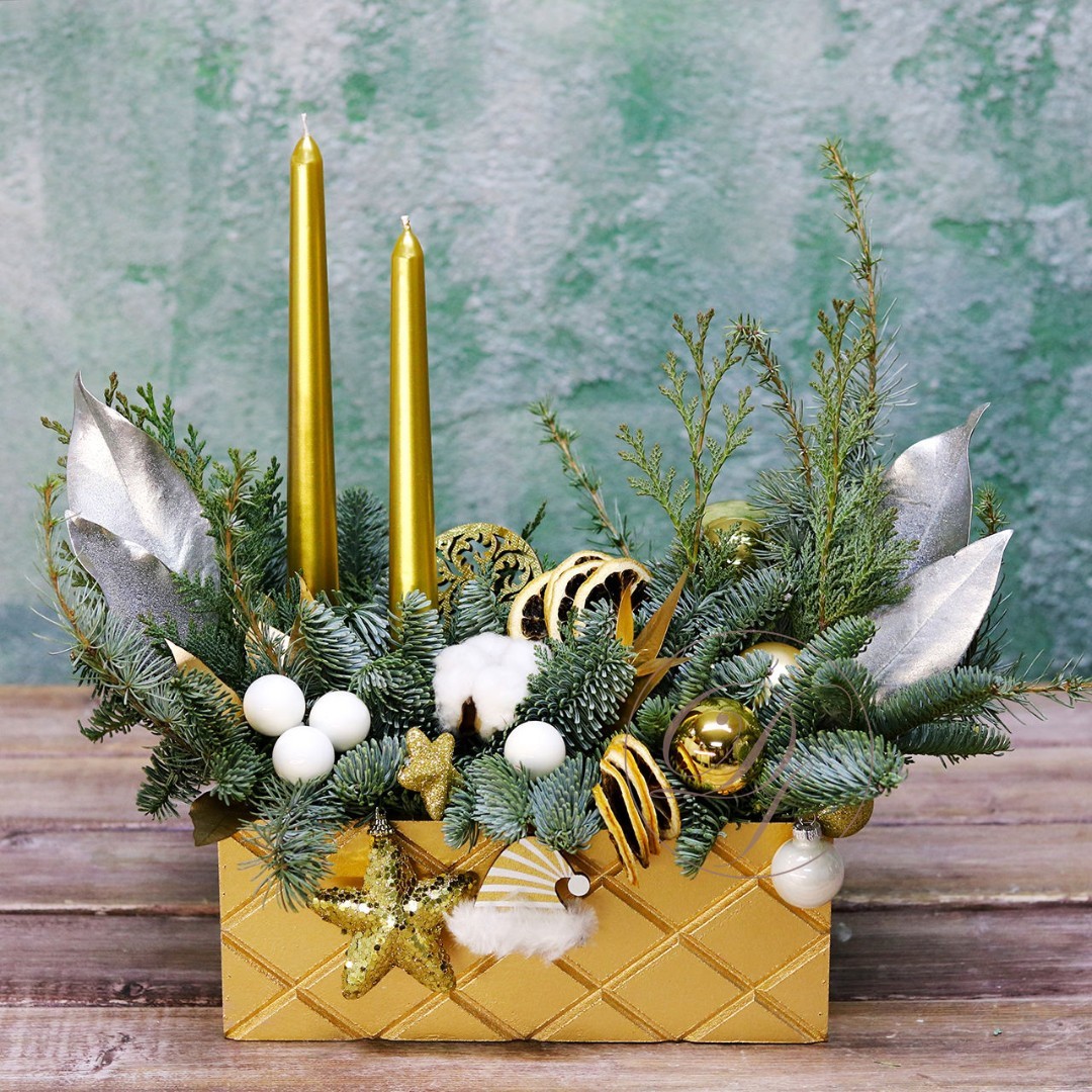 Деревянный ящик с новогодним декором - чудесный подарок для родных и друзей. Авторская новогодняя композиция из натуральной ели, выполненная в деревянном ящике прямоугольной формы. Этот подарок станет прекрасным украшением в домашнем интерьере и будет радовать получателя долгое время. Композиция выполнена на специальной флористической губке, она пропитана водой, это позволяет хвои максимально долго сохранять свою свежесть.