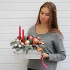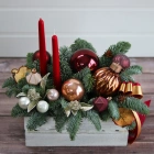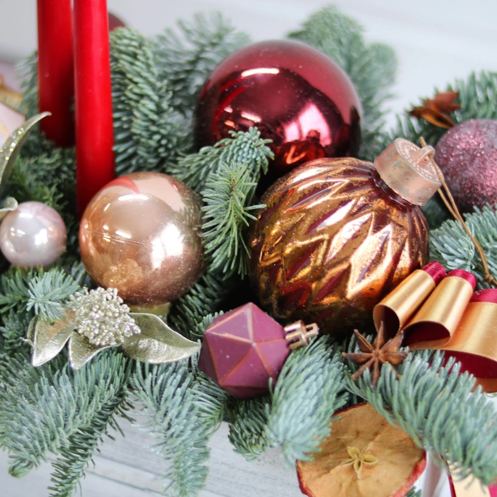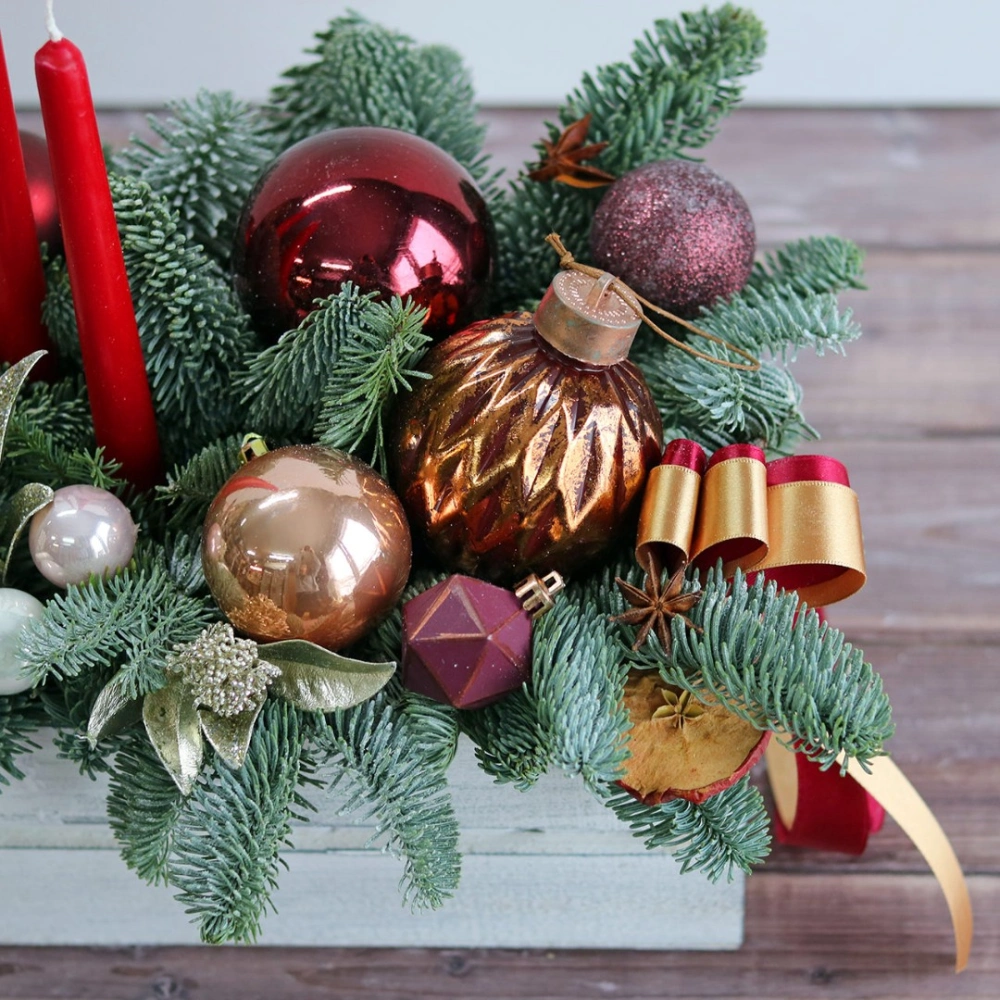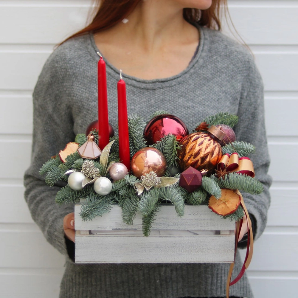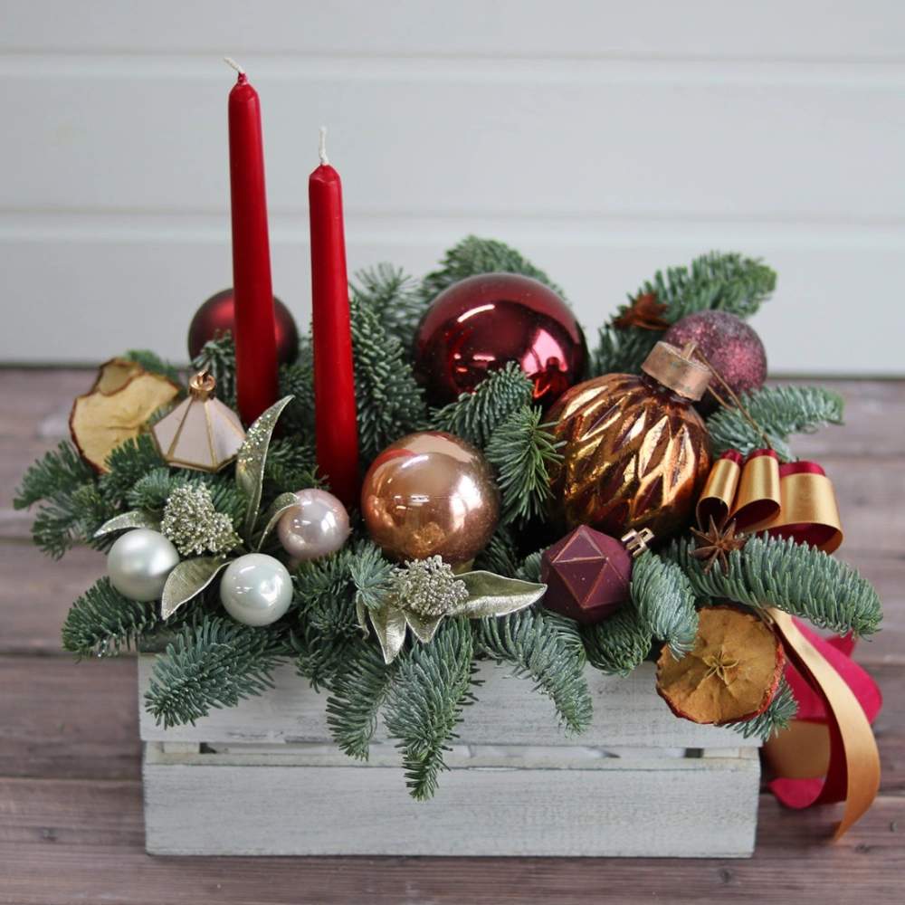 Новогодняя композиция из натуральной хвои со свечами и декором на заказ. На фотографии размер S. Размер композиции можно выбрать в карточке товара.