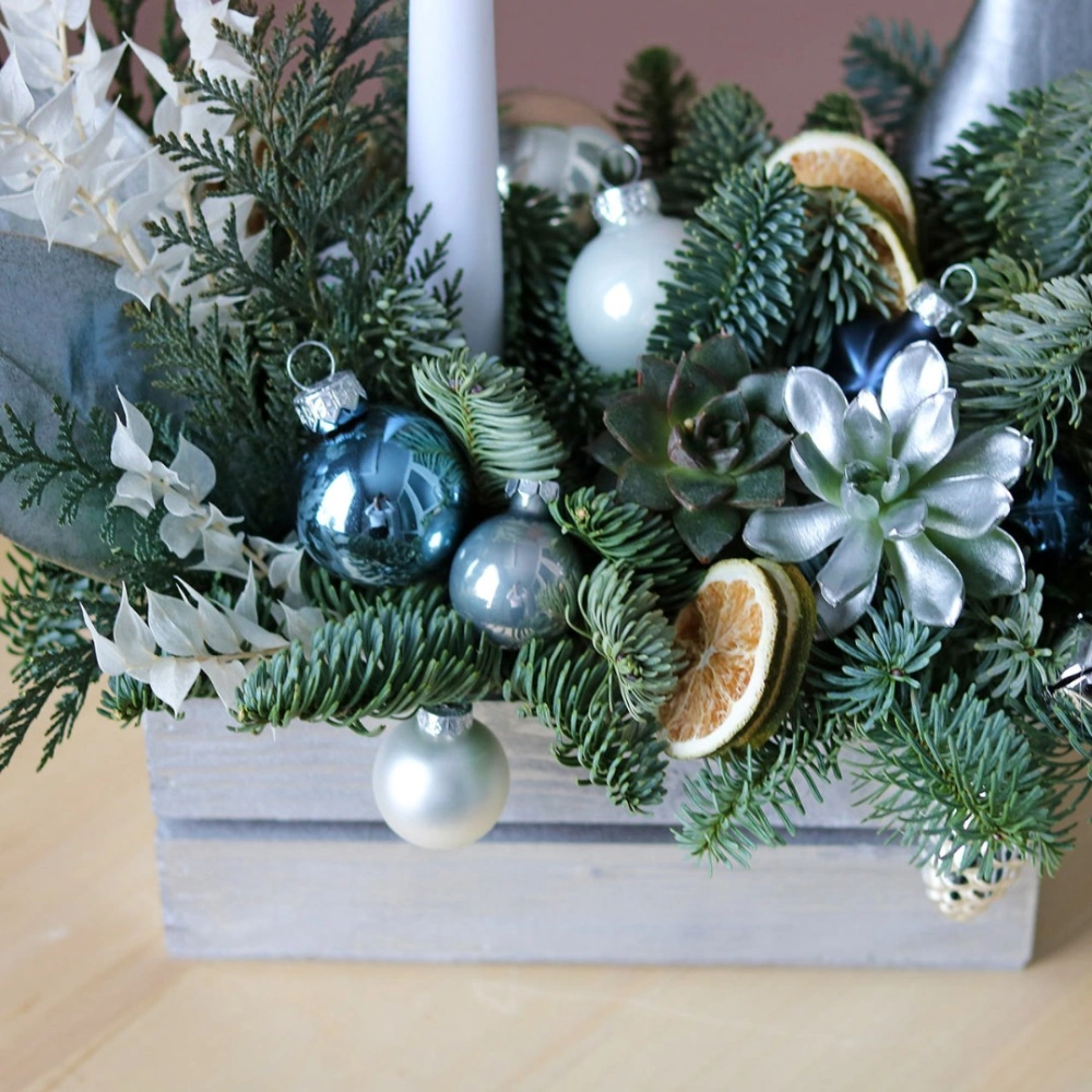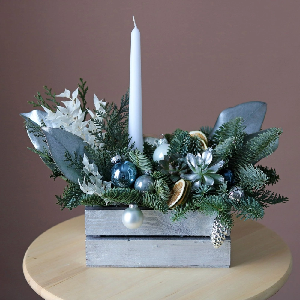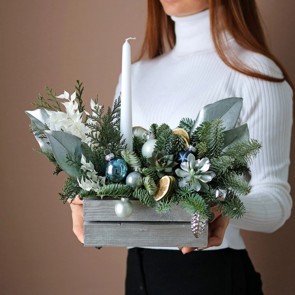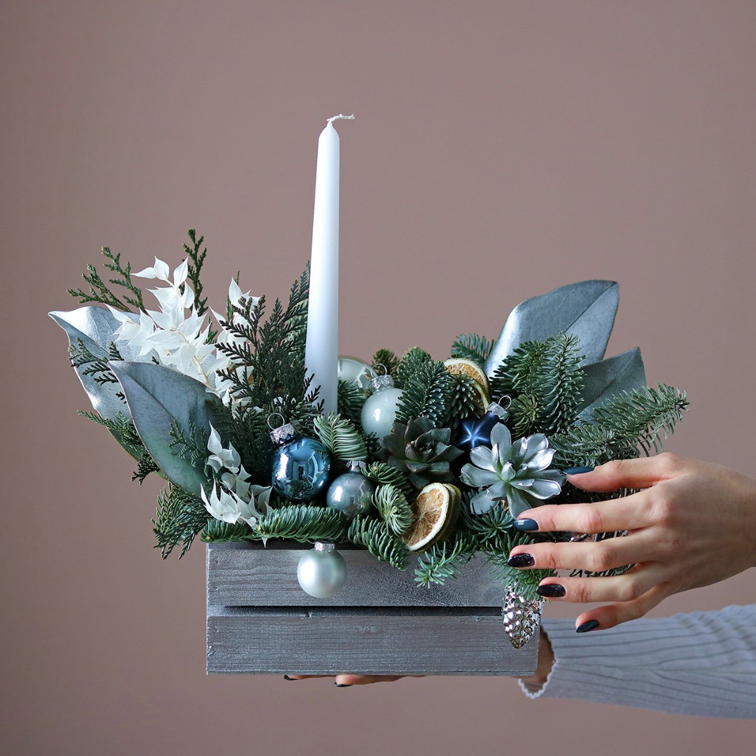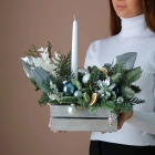 Деревянный ящик с новогодним декором - чудесный подарок для родных и друзей. Авторская новогодняя композиция из натуральной ели, выполненная в деревянном ящике прямоугольной формы. Этот подарок станет прекрасным украшением в домашнем интерьере и будет радовать получателя долгое время. Композиция выполнена на специальной флористической губке, она пропитана водой, это позволяет хвои максимально долго сохранять свою свежесть.