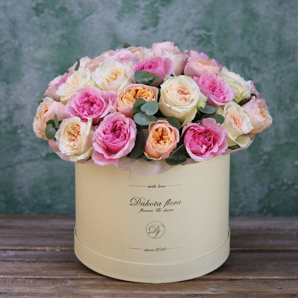 Цветы в коробках это композиции, составленные с использованием специальной губки Oasis (пиафлор) которая пропитана водой. Для того чтобы цветы дольше оставались свежими, добавляйте в нее немного воды каждый день.