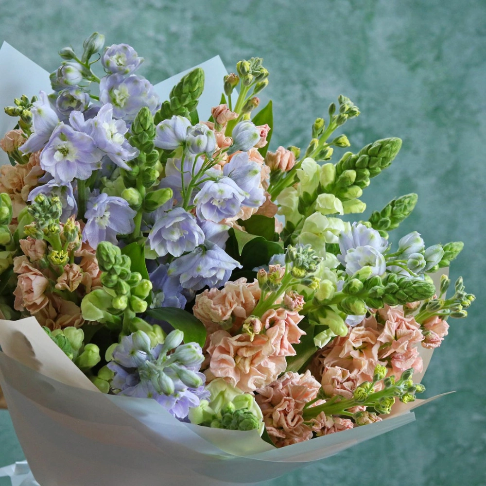 Полевой букет из маттиолы, антиринума и дельфиниума. Вы можете выбрать любой размер из указанных в перечне к данному букету.