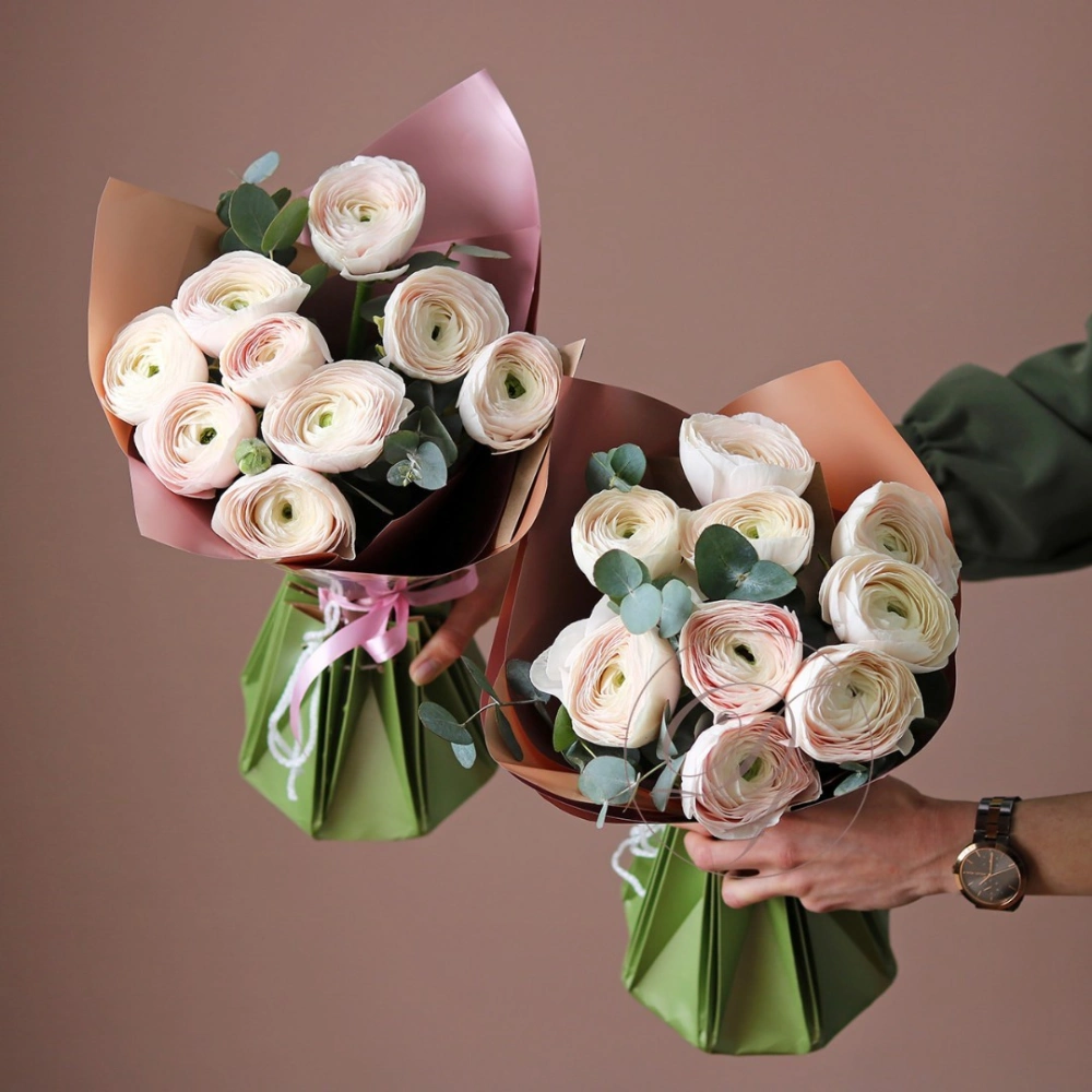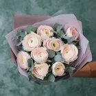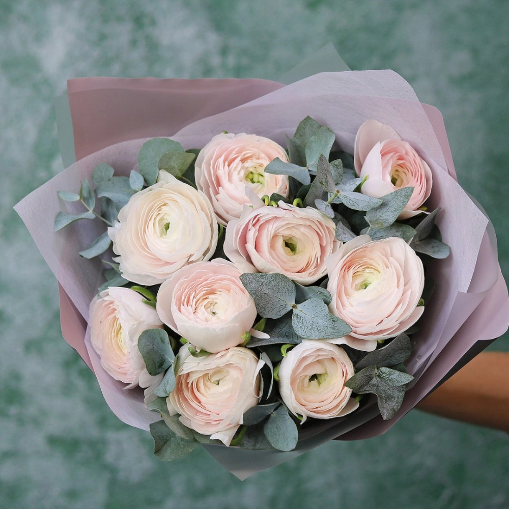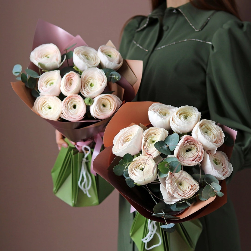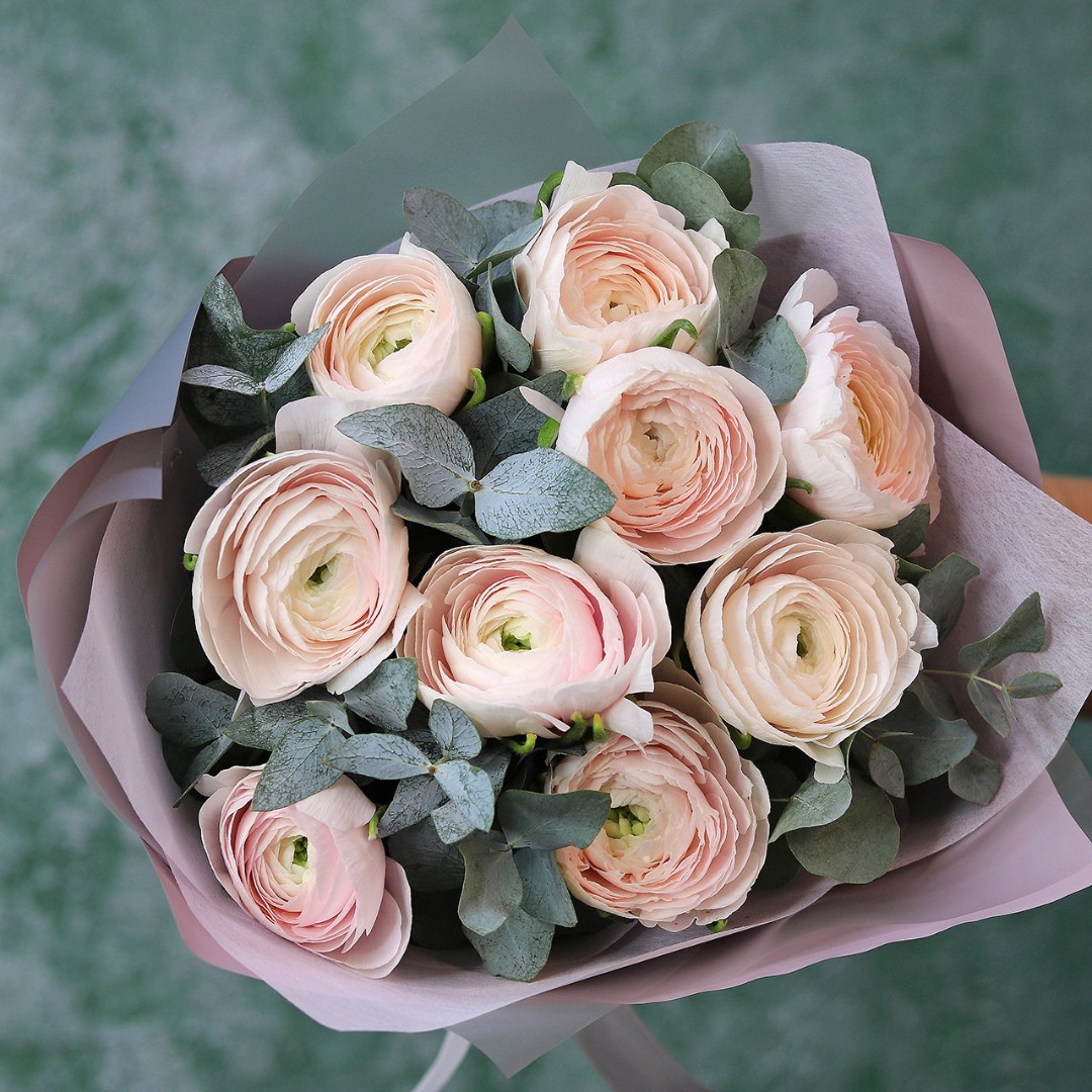 Букет из Ранункулюсов с эвкалиптом. На фотографии букет из 9 ранункулюсов. Вы можете выбрать любое количество цветов указанное в перечне к данному букету.