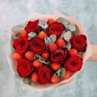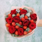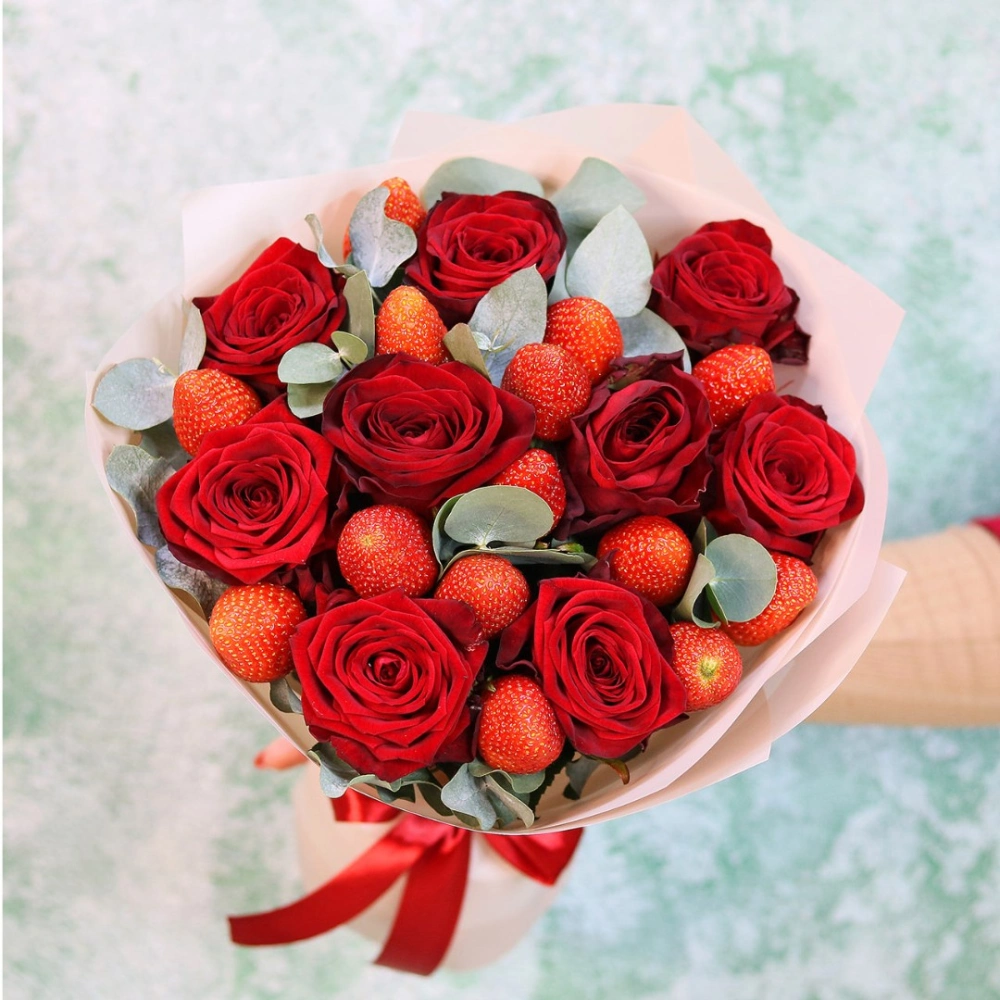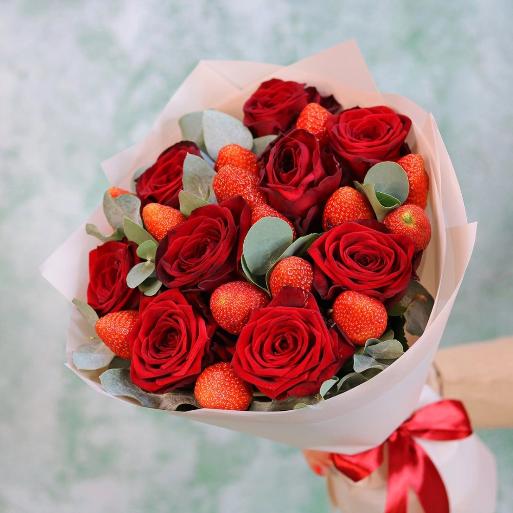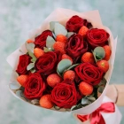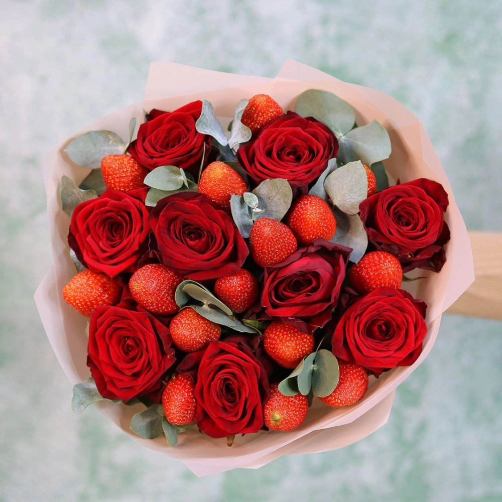 Букет из роз и свежей клубники. Авторские букеты с добавлением сладостей в виде: баночки меда peroni, французских пирожных macarons, имбирных пряников и свежих ягод.