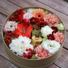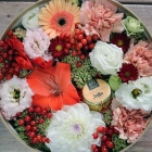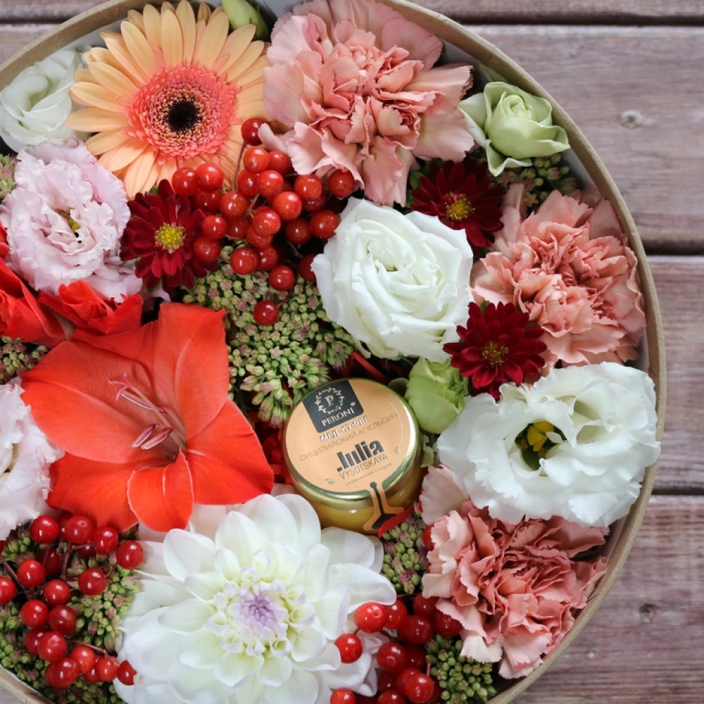 Авторские цветочные композиции в элегантных коробках различных форм, цветов, размеров, с добавлением сладостей в виде: баночки меда peroni, французских пирожных macarons, имбирных пряников и свежих ягод.