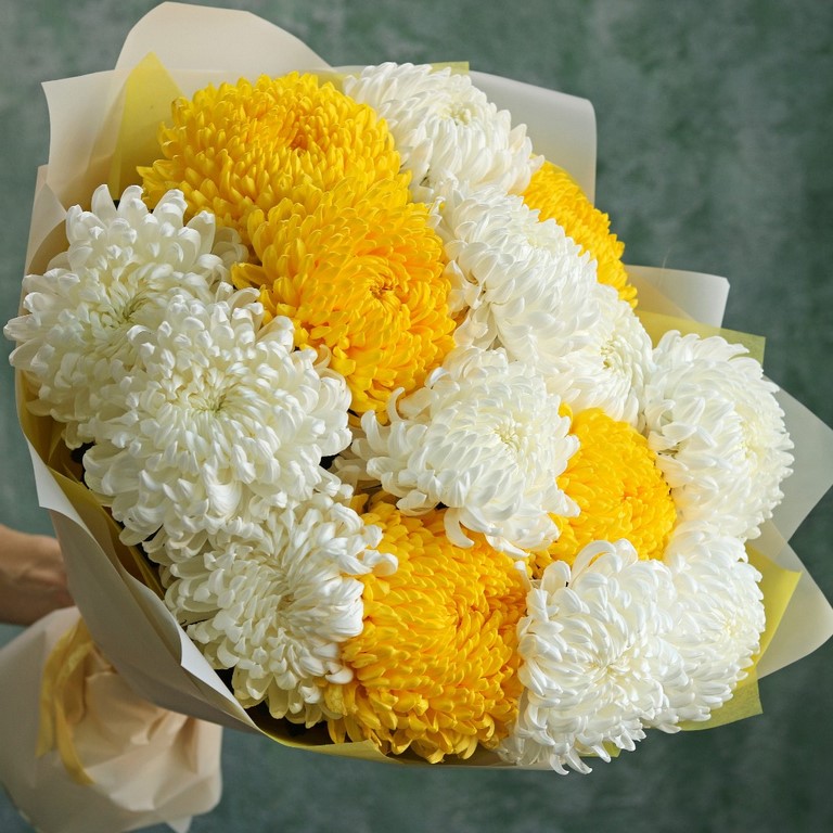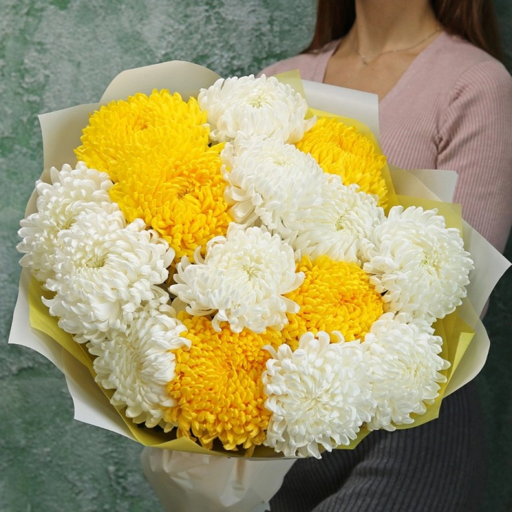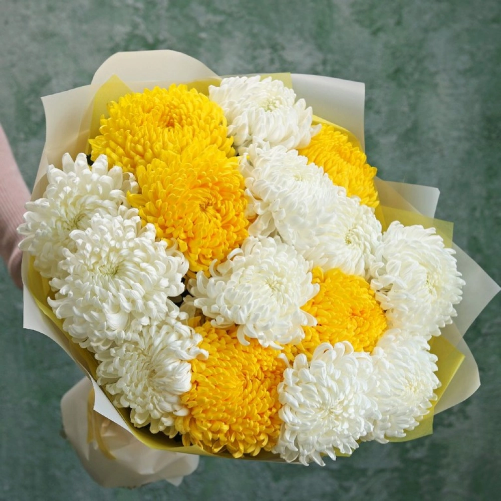 Букет из белых и желтых шаровидных Хризантем. Вы можете выбрать любое количество цветов указанное в перечне к данному букету.