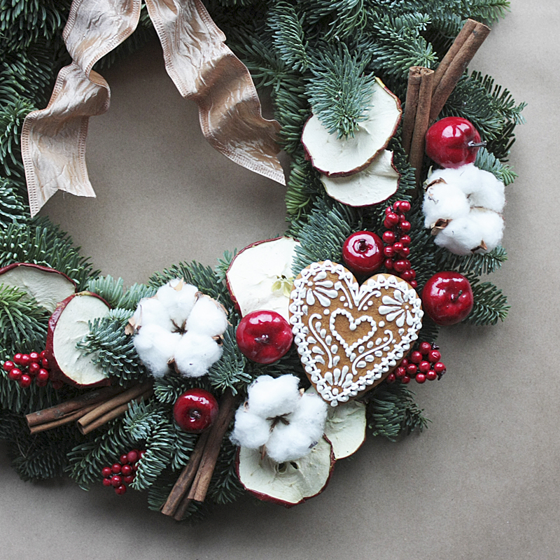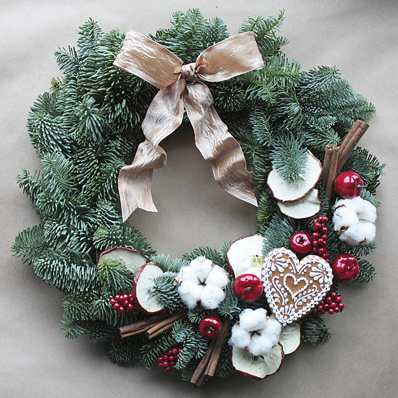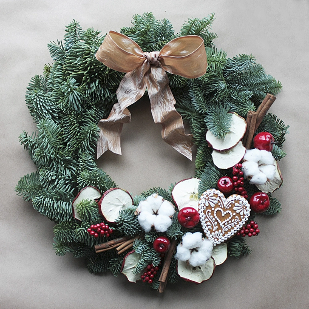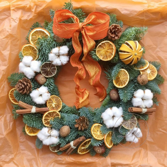 Очаровательный Новогодний венок из натуральной ароматной ели украшенный разнообразным новогодним декором - коробочками мягкого хлопка, корицей дольками яблока, шишками, узорной фигурой. Такой венок станет замечательным подарком в преддверии Нового Года и Рождества для ваших родных, друзей, родителей, коллег, знакомых.
