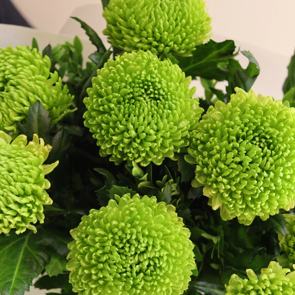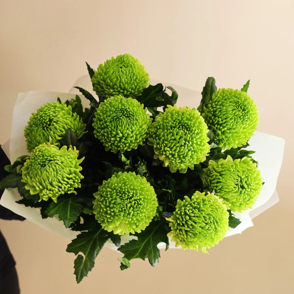 Букет из одноголовых хризантем зеленого цвета. Вы можете выбрать любое количество цветов указанное в перечне к данному букету.
